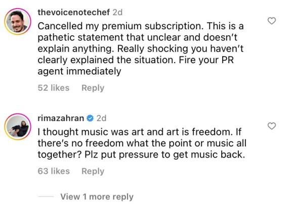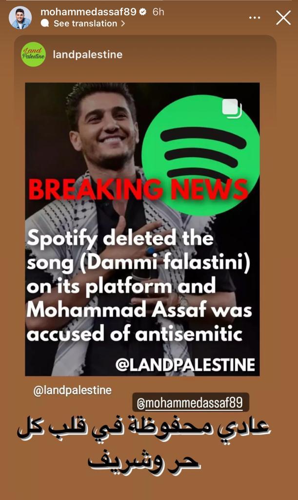 كما ردّت "سبوتيفاي" على أحد التعليقات في منشورها، أنّه "لم يتم إزالة محتوى الفنان محمد عسّاف بسبب مخالفة قواعد منصتنا، ولكن قُدم طلب من الموزع بإزالته ونحن نأمل أن يعود المحتوى على منصتنا قريباً".