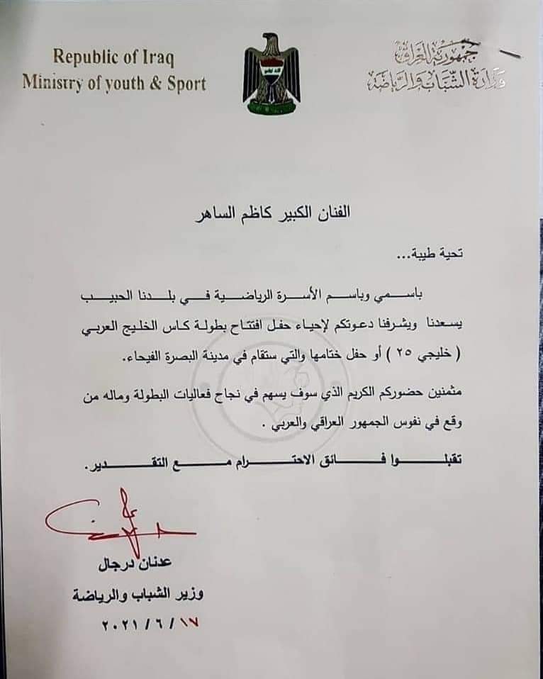 انتشرت منذ أيام أخبار عن نية وزير الشباب والرياضة العراقي، اللاعب السابق عدنان درجال، توجيه دعوة للفنان كاظم الساهر لإحياء بطولة كأس الخليج العربي الـ 25 والتي ستقام في محافظة البصرة جنوب العراق، ولم يتم التأكد من صحّة الأخبار، إلى أن انتشرت اليوم صورة عن الدعوة الرسمية التي وجهها درجال للساهر.