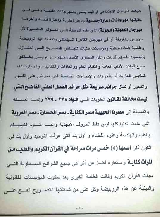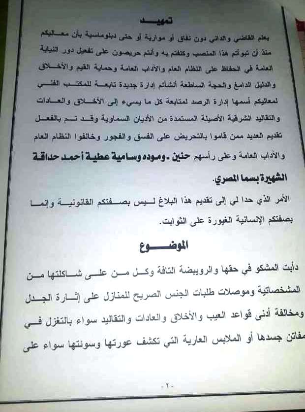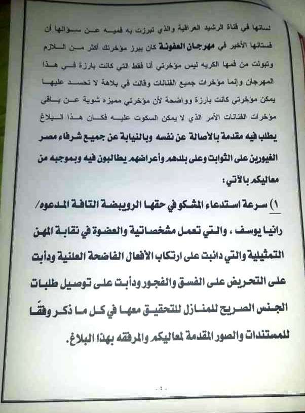 وطالب المحامي المصري، في بلاغه، بسرعة استدعاء رانيا يوسف، خاصة أنها "اعتادت التحريض على الأعمال الفاضحة، وأعمال الفسق والفجور"، مطالباً بالتحقيق معها وفقاً للمستندات والصور التي قُدمت مع البلاغ.