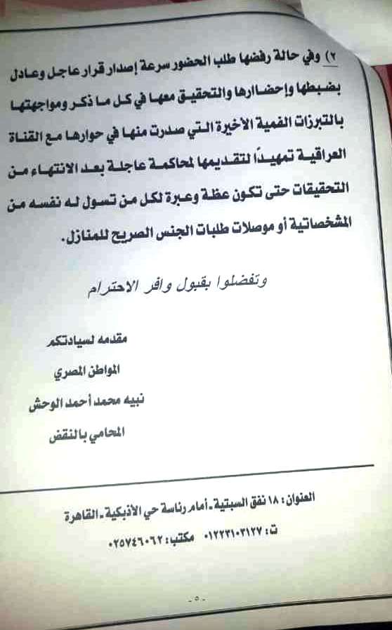 نبيه الوحش طالب بسرعة إصدار قرار بضبط وإحضار الفنانة، والتحقيق معها في حالة رفضها الحضور، وتقديمها إلى محاكمة عاجلة؛ لتكون عبرة وعظة للجميع.