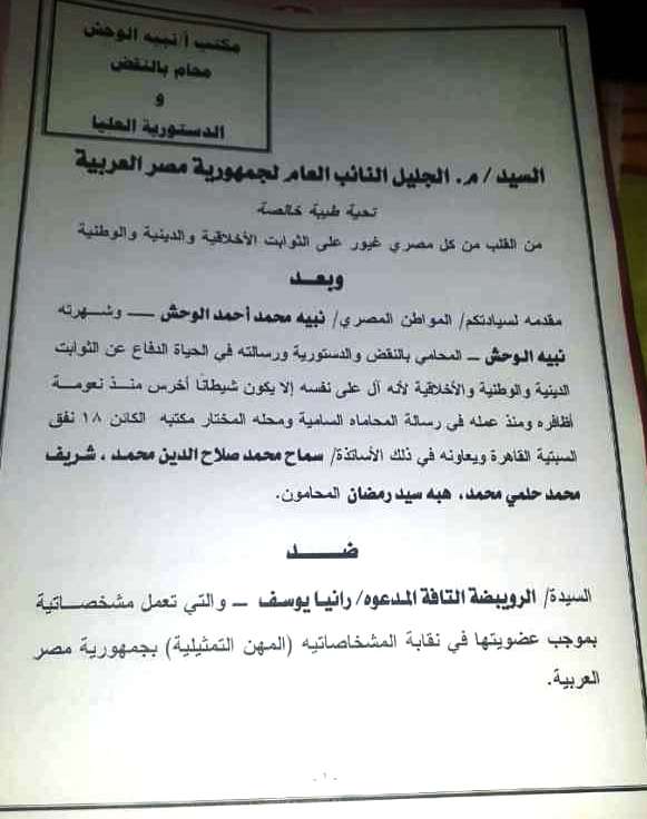 وأكد الوحش، في تصريحات صحافية، تقدمه و65 محامياً آخرين، ببلاغ للنائب العام، مؤكداً أنه يستهدف تجميع أكثر من 100 محامٍ مصري، للتصدي للفنانة رانيا يوسف، لتعديها على الثوابت الدينية، والقيم والعادات المصرية، وذلك بسبب تصريحاتها الأخيرة، وملابسها.