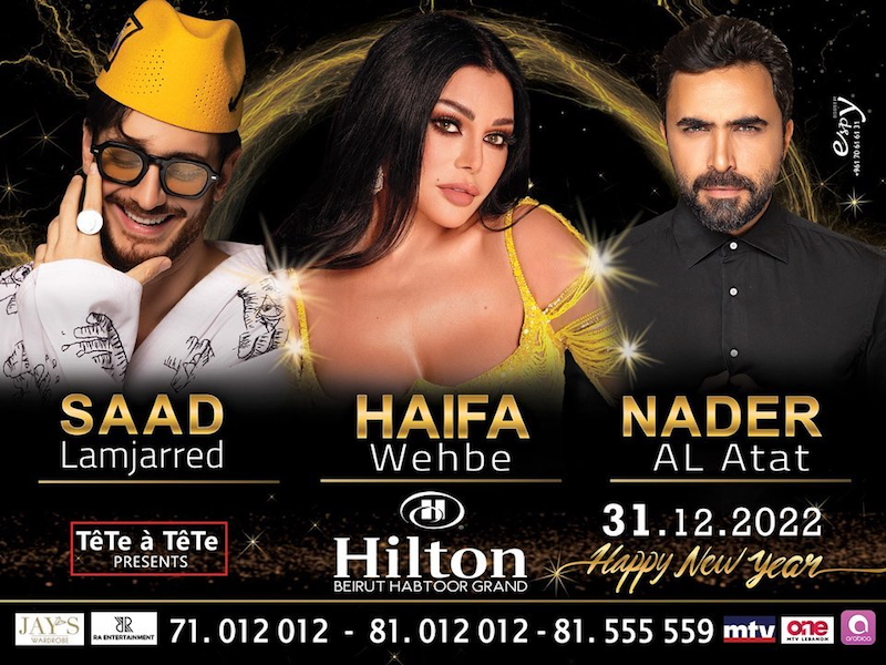 يستعدّ فندق "هيلتون بيروت" لإقامة حفل ضخم يجمع النجوم هيفاء وهبي، سعد المجرد، ونادر الأتات، وثُمّنت أسعار البطاقات بالدولار، بين 150 وصولاً إلى 600. ووصلت نسبة الحجوزات إلى 80 في المئة،