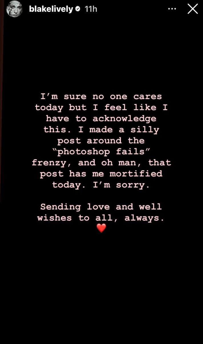 واعتذرت الممثلة الأميركية بليك ليفلي عن سخريتها من الصورة الأخيرة المعدّلة التي جمعت كيت بأولادها وكتبت في حسابها عبر "إنستغرام": "أنا متأكّدة من ألّا أحد يهتمّ اليوم، ولكنّي أشعر أنّني يجب أن أعترف بذلك. لقد كتبت منشورًا سخيفًا حول جنون "فشل الفوتوشوب"، لقد أصابني هذا المنشور بالخزي اليوم. أنا آسفة. أرسل الحبّ والتمنّيات الطيّبة للجميع دائمًا".