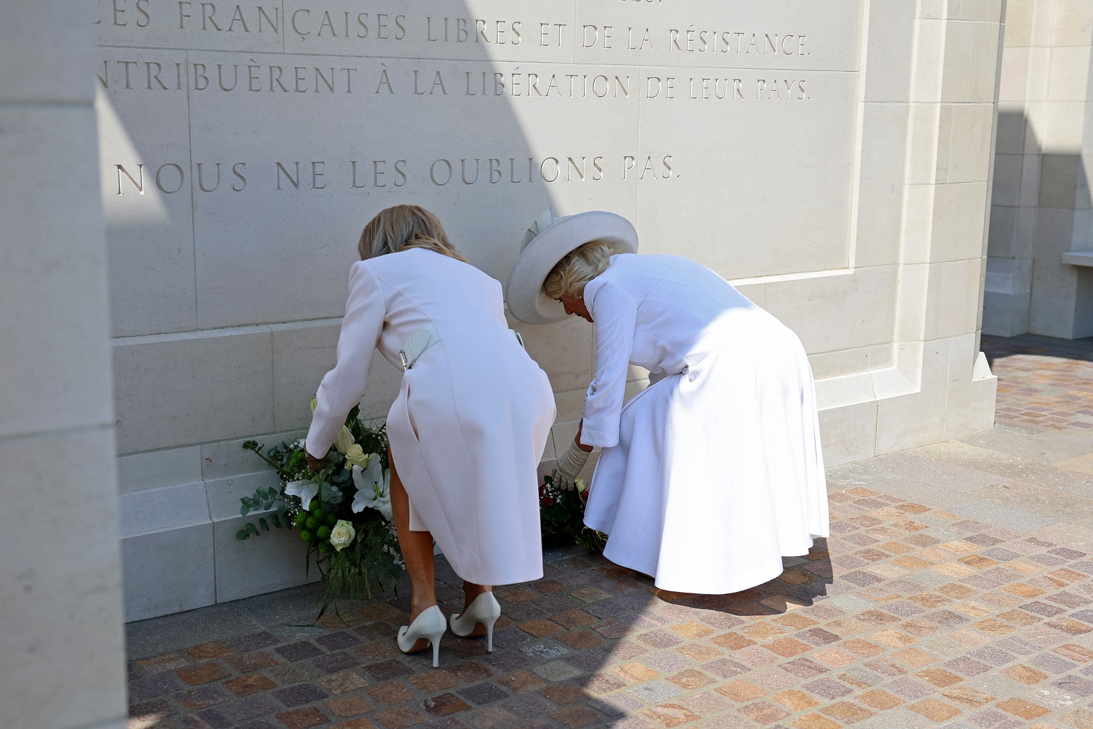 أوقعت زوجة الرئيس الفرنسي بريجيت ماكرون نفسها في موقف محرج أمام زوجة الملك تشارلز، الملكة كاميلا، خلال حضورهما معاً لوضع أكاليل الزهور على النصب التذكاري في النورماندي الفرنسية.