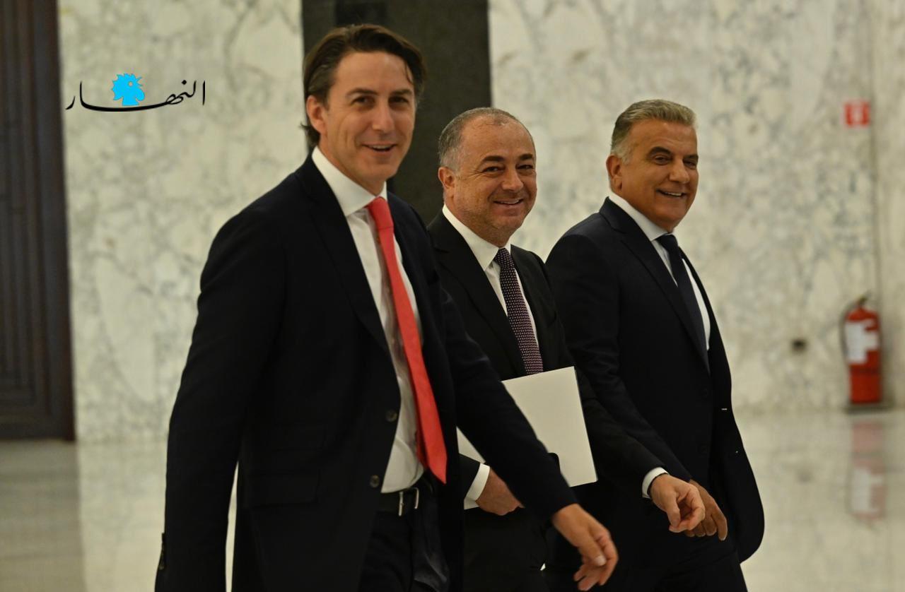 الوسيط الأميركي اموس هوكشتاين ونائب رئيس مجلس النواب الياس بوصعب والمدير العام للأمن العام اللواء عباس إبراهيم يدخلون معاً مكتب رئيس الجمهورية ميشال عون لعقد لقاء موسع حول ترسيم الحدود البحرية (نبيل إسماعيل).