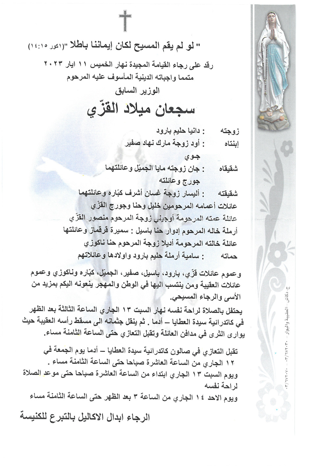 أعلنت عائلة الوزير السابق والكاتب في جريدة "النهار" والعضو سابقاً في حزب "الكتائب" سجعان قزي عن موعد تشييع جثمانه، وإقامة الصلاة لراحة نفسه نهار السبت 13 الجاري الساعة الثالثة بعد الظهر في كاتدرائيّة سيّدة العطايا - أدما. ثم يُنقل جثمانه إلى مسقط رأسه العقيبة حيث يوارى الثرى في مدافن العائلة وتقبل التعازي حتى الساعة الثامنة مساء.
