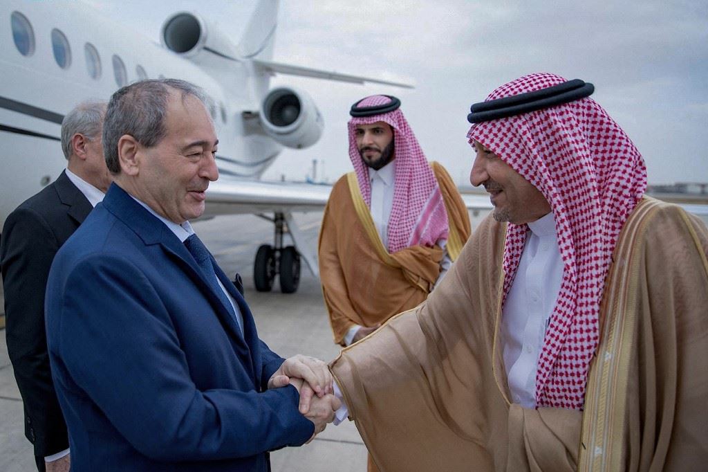 نائب وزير الخارجية السعودي مستقبلاً وزير الخارجية السوري فيصل مقداد عند وصوله إلى مطار جدة (أ ف ب).