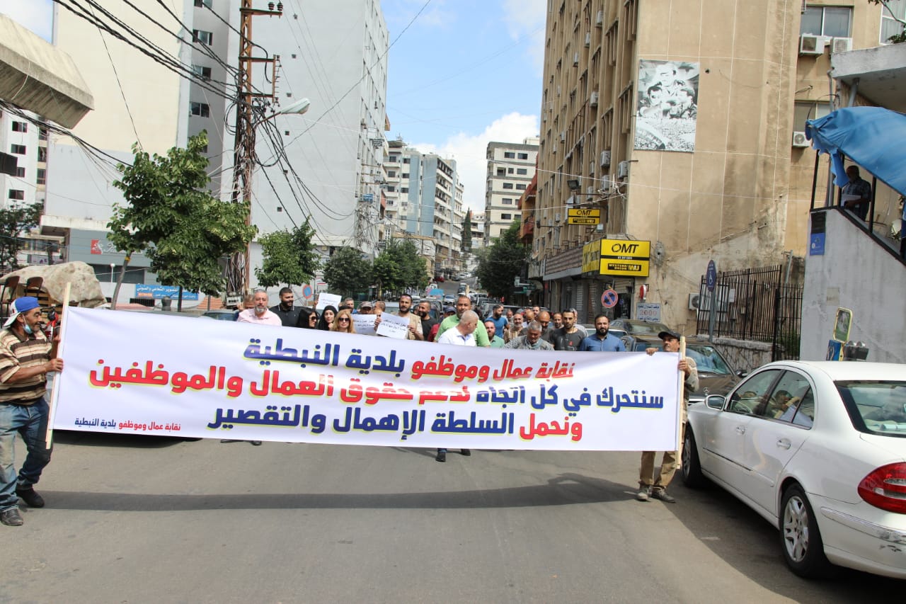 نظمت نقابة عمال وموظفي بلدية النبطية وقفة احتجاجية امام السرايا الحكومية في النبطية احتجاجا على عدم قبض رواتبهم والمساعدة الاجتماعية والطبابة وذلك بمشاركة عمال وبلديات منطقة النبطية حيث شارك في الوقفة امين سر اتحاد البلديات في لبنان ورئيس اتحاد نقابات العمال والمستخدمين في النبطية حسين وهبي مغربل، وعضوا بلدية النبطية صادق إسماعيل وطارق بيطار، رئيس نقابة سائقي السيارات العمومية في النبطية علي كمال، مسؤول النقابات في حزب الله ربيع نور الدين وجمع غفير من عمال البلديات وموظفيها وفاعليات .