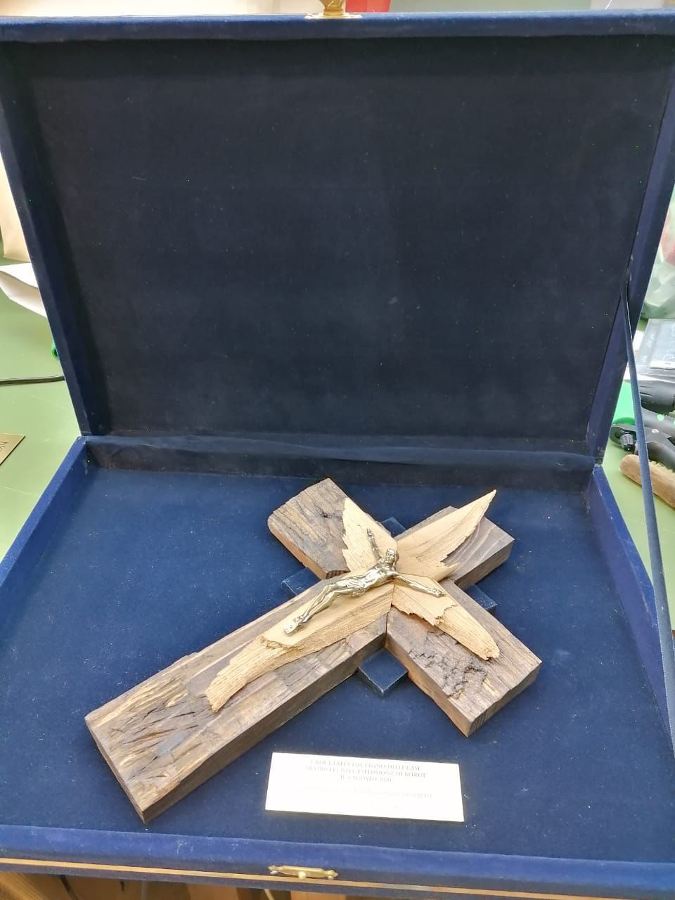 تسلم البابا فرنسيس امس صليباً مصنوعاً من اخشاب الابواب والنوافذ المحطمة في بيروت جراء انفجار الرابع من آب، صنع في ابرشية بيروت المارونية، وحمله اليه هدية الرئيس العام للرهبانية المارونية المريمية الاباتي بيار نجم المنتخب حديثاً والذي يزور الفاتيكان للمرة الاولى بعد انتخابه. وقد رافقه المدبر العام الاب دومينيك العلم والوكيل العام لدى الكرسي الرسولي الاب شربل حداد، ووكيل دير مار انطونيوس الكبير الاب شربل فرح.