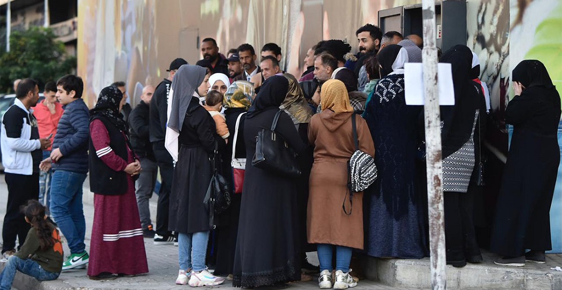 لاجئون سوريون أمام الصراف الآلي في لبنان