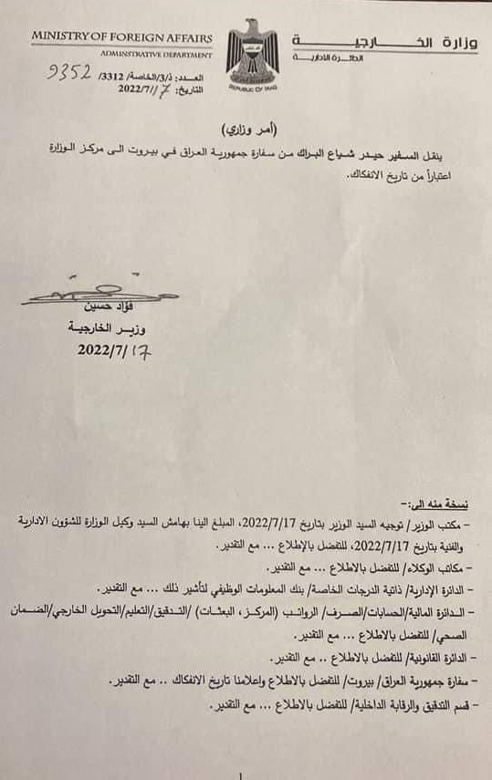 بالوثيقة- بعد استقباله بالـ"RBG7" في بعلبك... أمر وزاريّ عراقيّ بنقل السفير البراك إلى بغداد