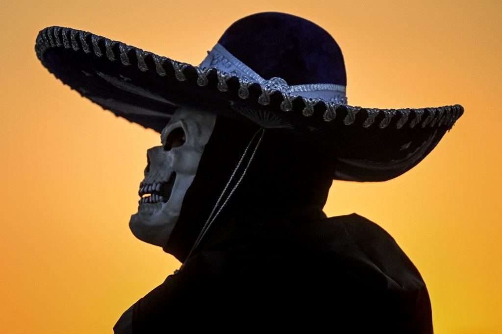 مشجع مكسيكي يرتدي قناعاً يصل لمباراة قطر 2022 في المجموعة الثالثة لكرة القدم بين المكسيك وبولندا (أ ف ب).