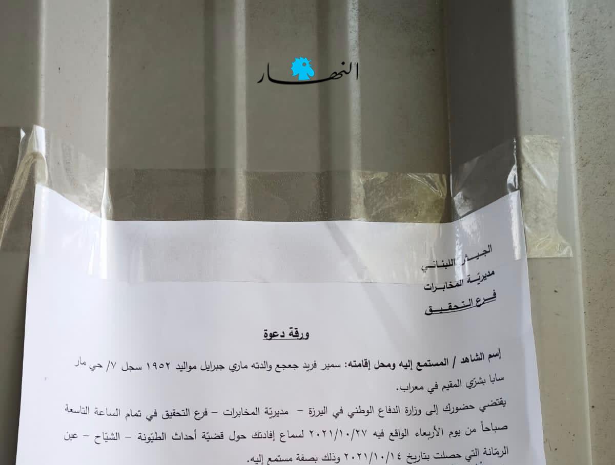 علمت "النهار" أن عنصراً من فرع المخابرات قصد معراب لتسليم رئيس حزب القوات اللبنانية سمير جعجع الدعوة للاستماع إليه في موضوع حادثة الطيونة لكن الأخير لم يكن على السمع، فتم تبليغه عبر اللصق.