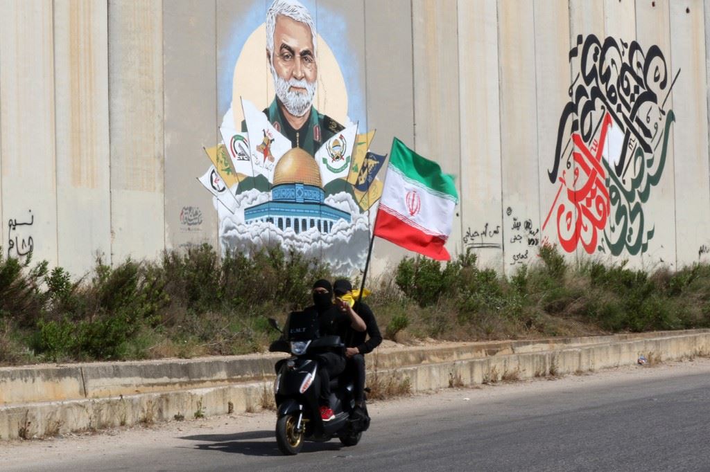 شابان على دراجة نارية يرفعان العلم الإيراني مقابل الجدار الفاصل مع الحدود الفلسطينية جنوب لبنان (أ ف ب).