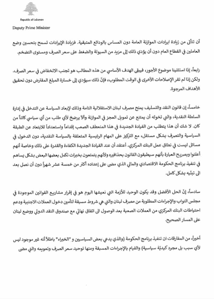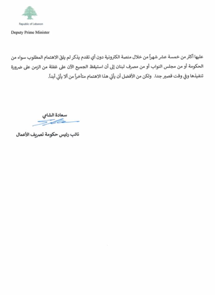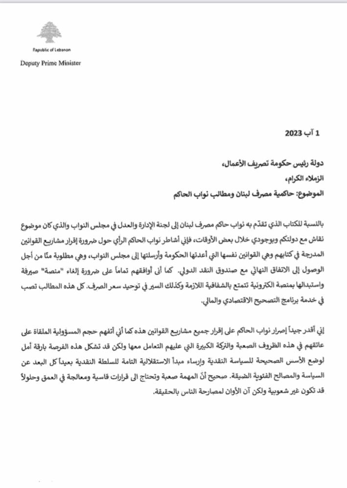 أرسل نائب رئيس حكومة تصريف الاعمال سعادة الشامي رسالة إلى رئيس الحكومة نجيب ميقاتي بشأن حاكمية مصرف لبنان ومطالب نواب الحاكم التي ارسلوها إلى لجنة الادارة والعدل.