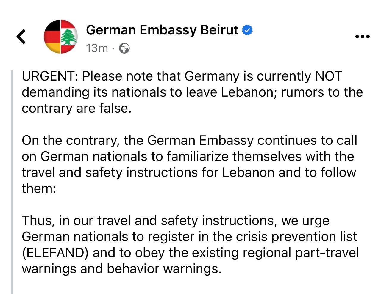 ولاحقاً، نبّهت السفارة الألمانيّة في لبنان أنّ "ألمانيا لم تطلب من مواطنيها في الوقت الحاليّ مغادرة البلاد"، نافيةً الشائعات.