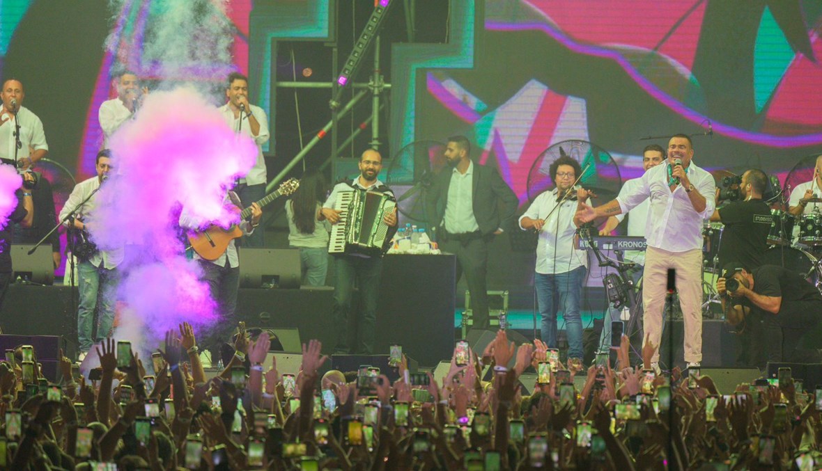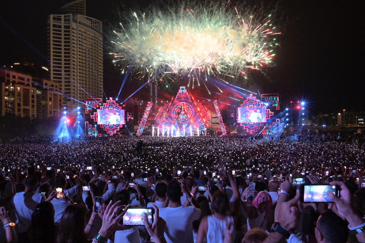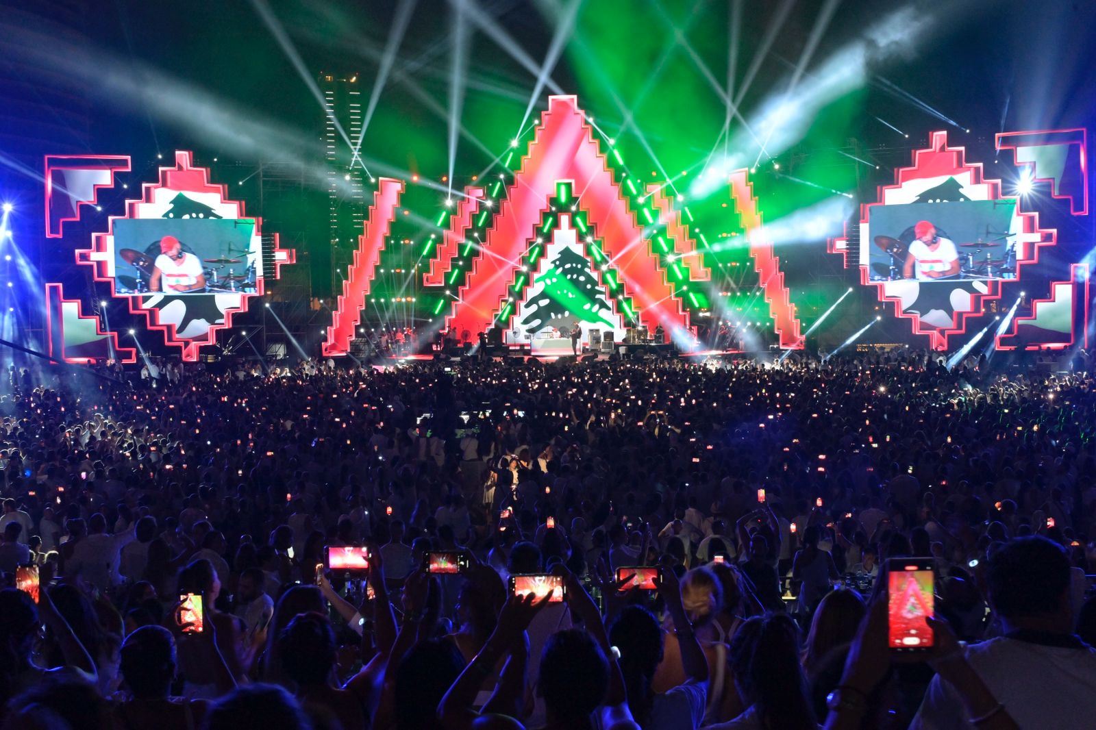 العلم اللبناني يتصدّر حفلة رودج وعمرو دياب في وسط بيروت ليل السبت (نبيل اسماعيل).