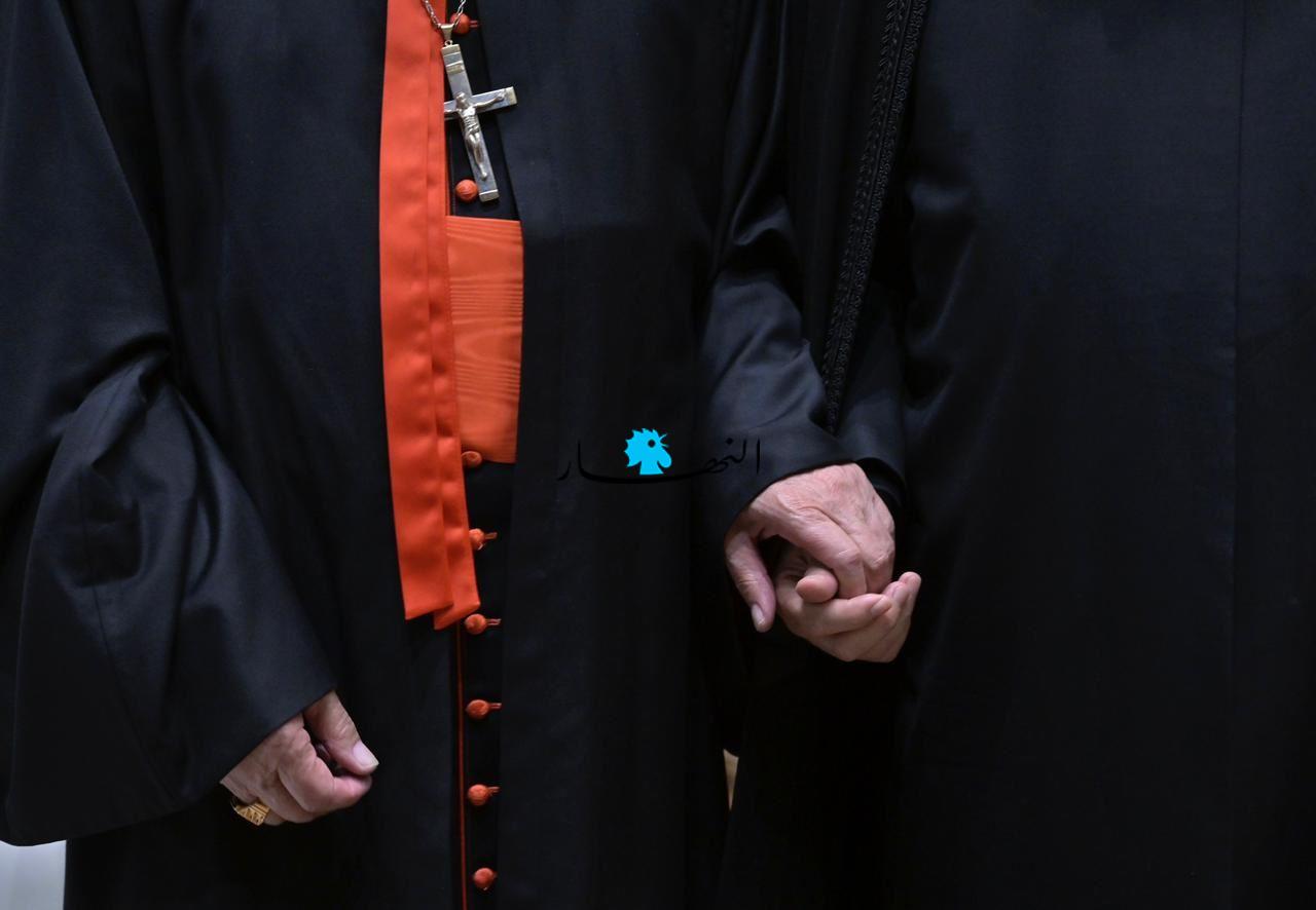 البطريرك الراعي يُمسك بيد شيخ العقل لطائفة الموحدين الدروز الشيخ سامي أبي المنى لحظة وصوله إلى مكتبة بعقلين (نبيل إسماعيل).