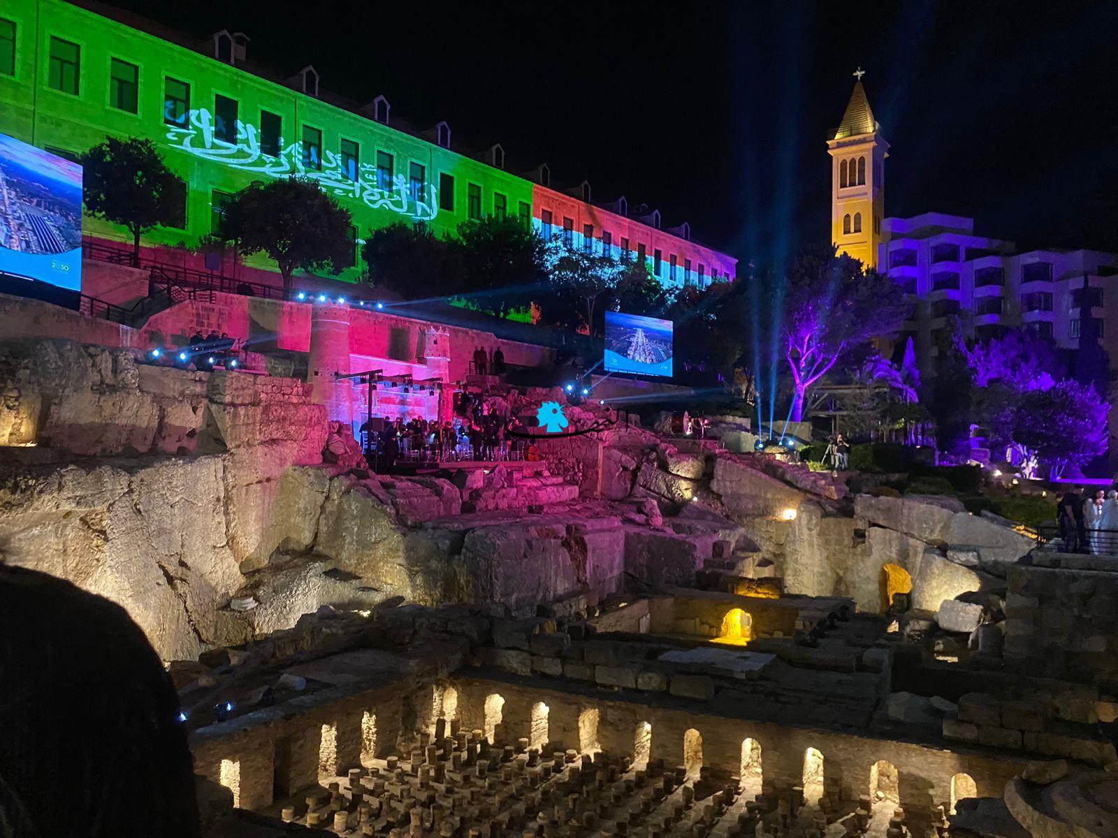 المدرج الروماني في وسط بيروت يتزيّن بالعلمين اللبناني والسعودي خلال احتفال اليوم الوطني السعودي الـ93 ("النهار").