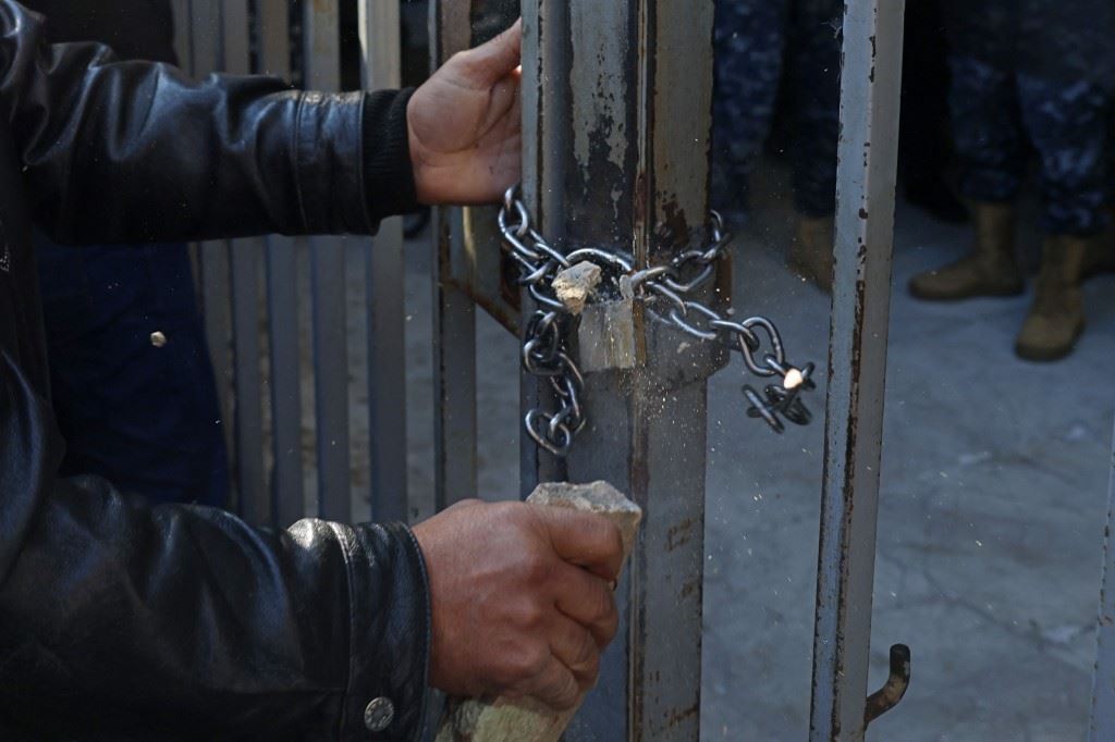 أحد أقارب أحد ضحايا الانفجار يُحاول كسر قفل بوابة مدخل قصر العدل خلال التجمّع خارج المبنى (26 ك2 2023 - أ ف ب).