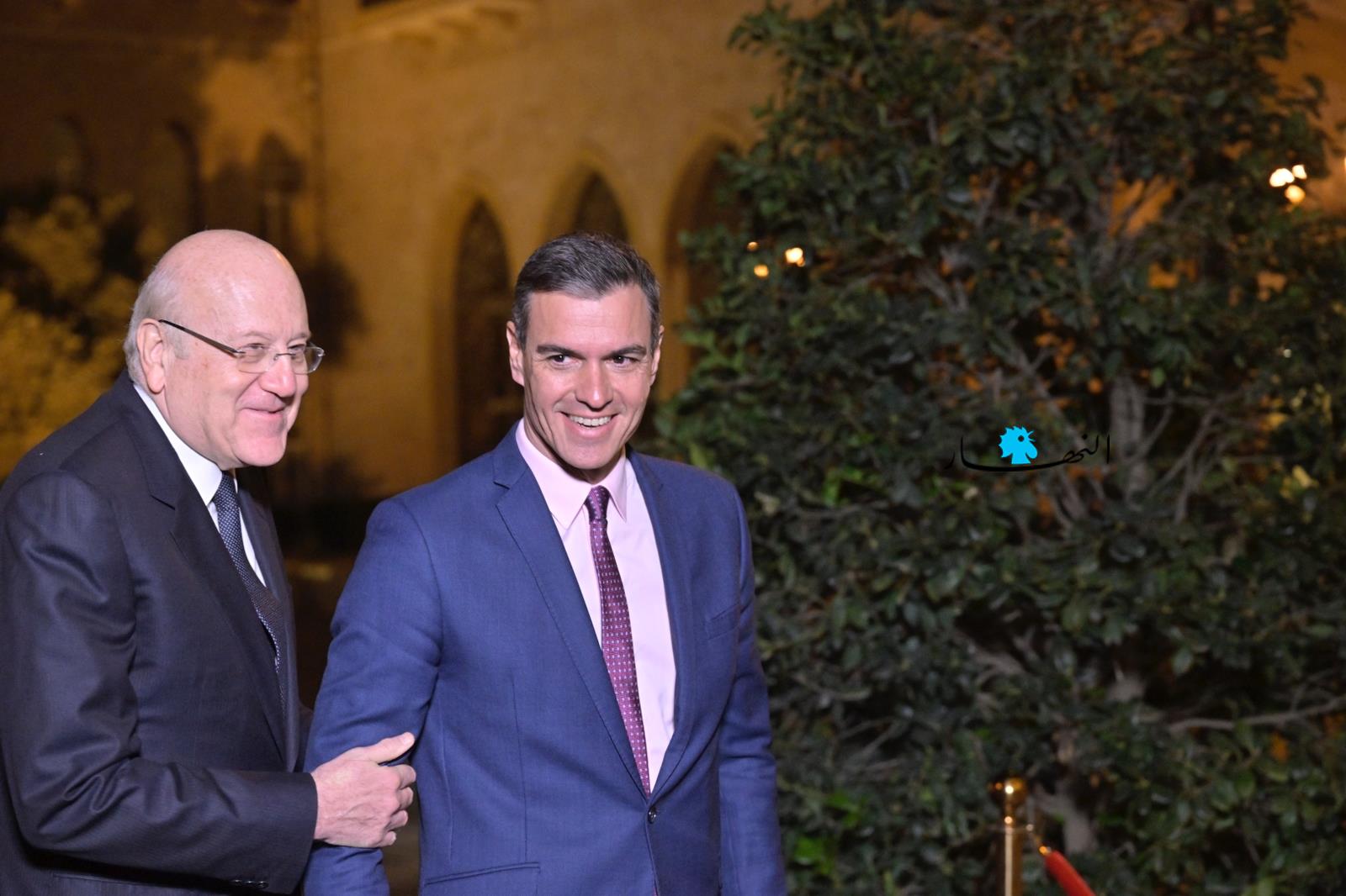 وكان ميقاتي ونظيره الاسباني عقدا مساء اليوم، محادثات في السرايا الحكومية، في اطار الزيارة التي يقوم بها رئيس الحكومة الاسبانية الى لبنان وتفقده كتيبة بلاده العاملة في اطار القوات الدولية في الجنوب.