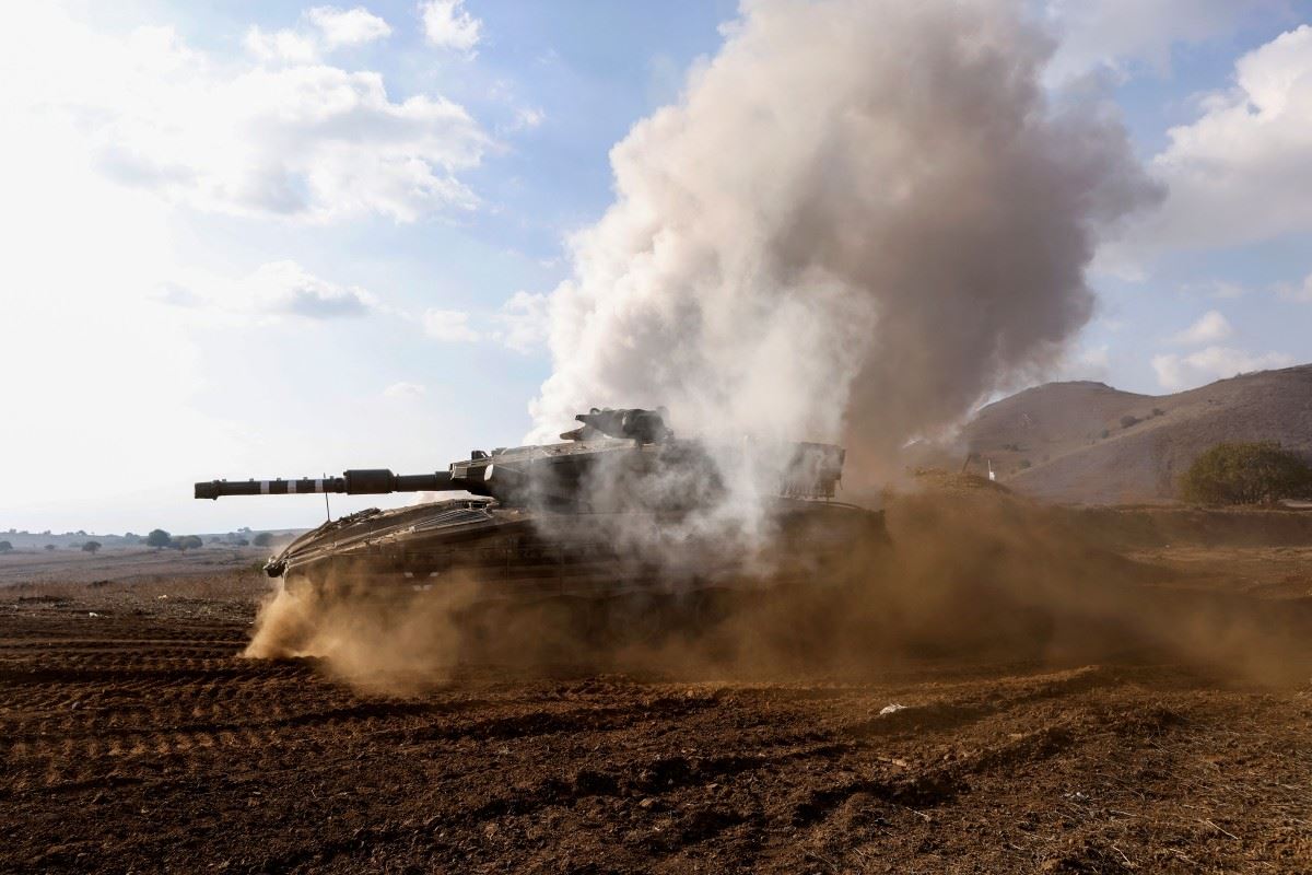 دبابة إسرائيلية تشارك في مناورة عسكرية في مرتفعات الجولان (أ ف ب).