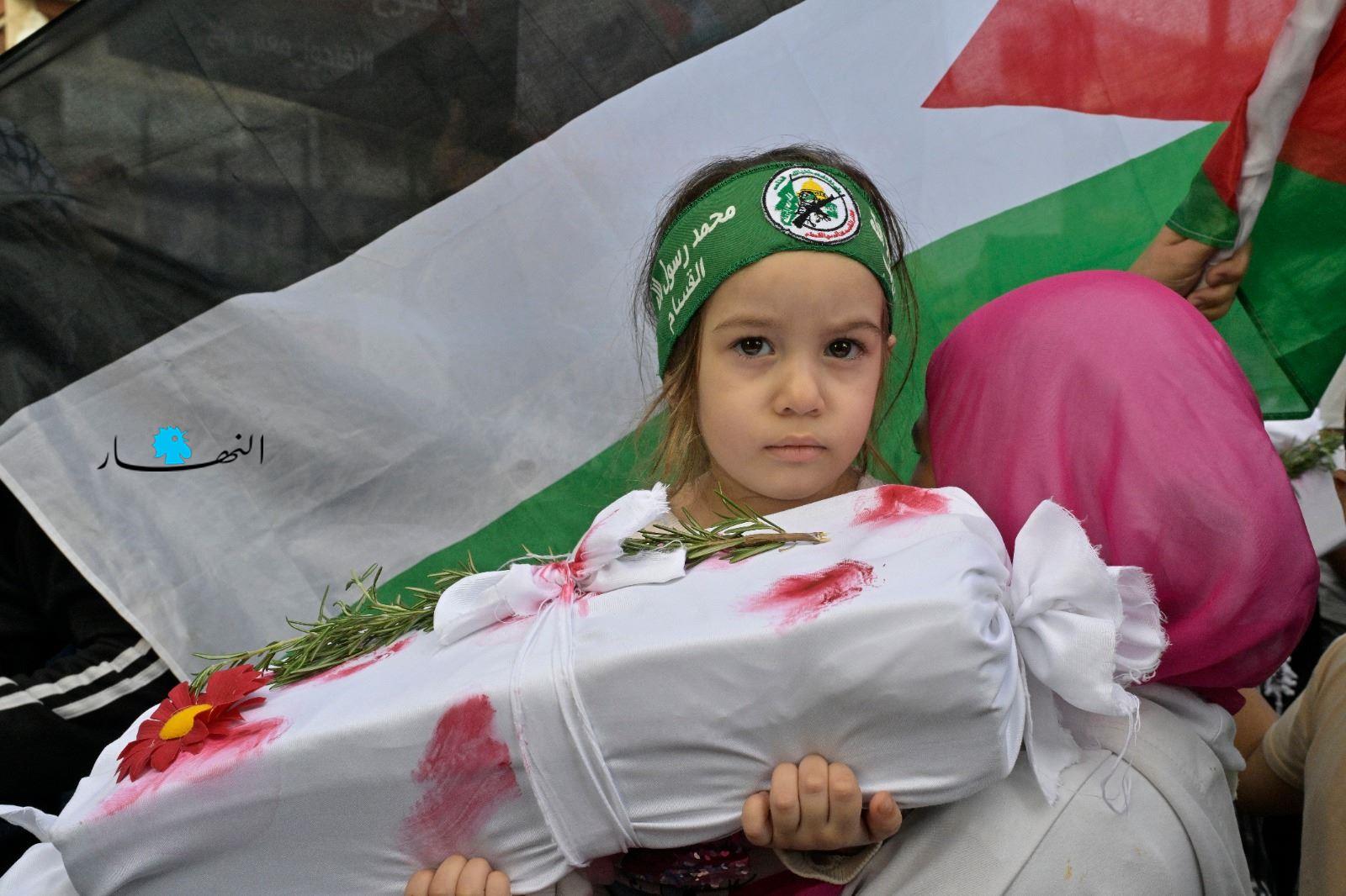 طفلة متضامنة مع غزّة ترفع مجسّماً لضحايا المجازر الإسرائيلية في وقفة أمام السفارة المصرية في بيروت (نبيل اسماعيل).