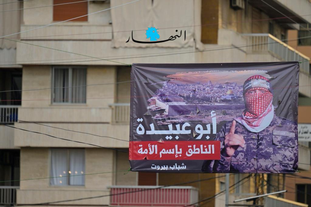 انتشرت مجموعة صور في أكثر من منطقة لبنانية لـ"أبو عبيدة" الناطق العسكري باسم كتائب الشهيد عز الدين القسام، الجناح العسكري لحركة المقاومة الإسلامية (حماس).