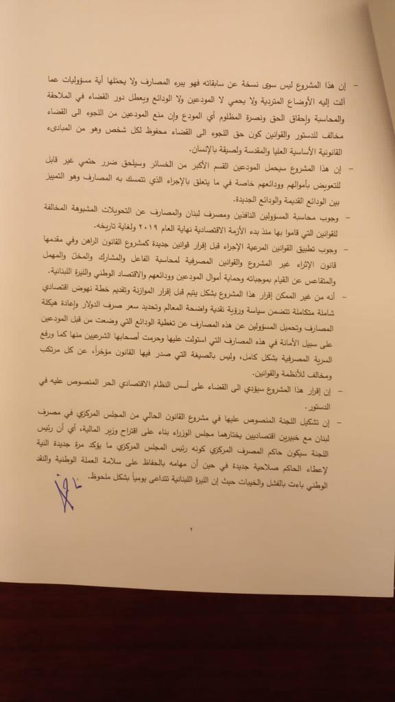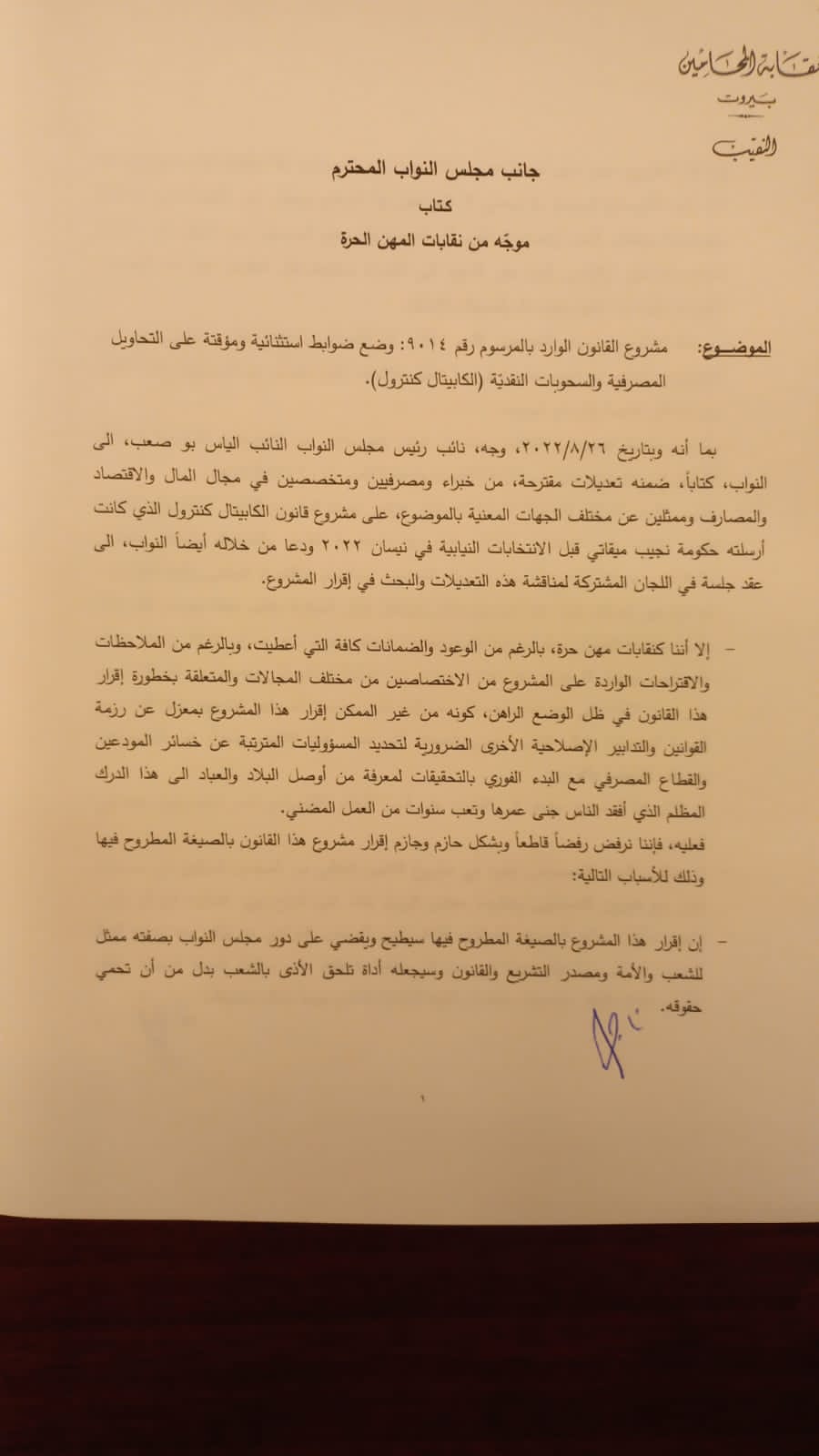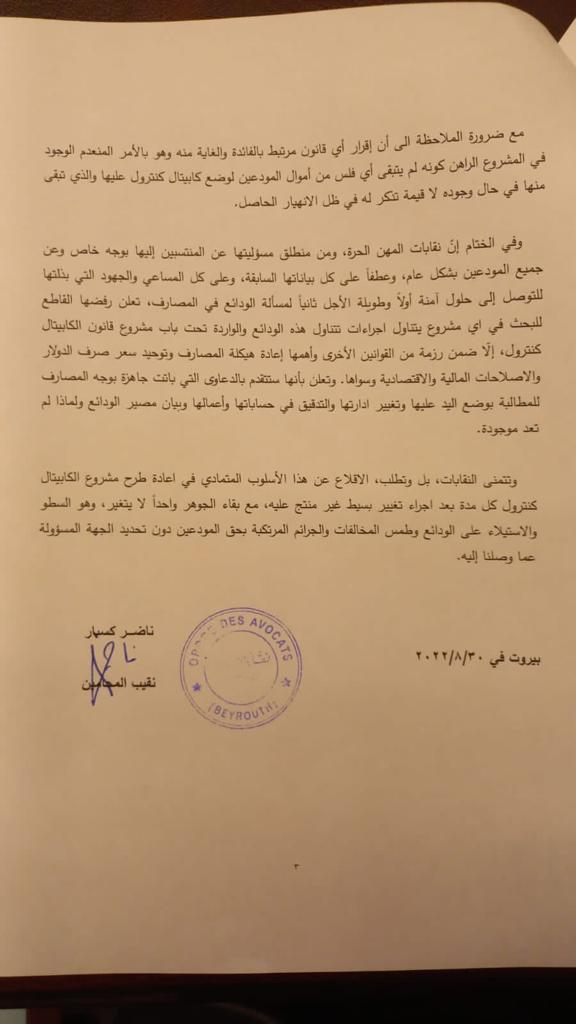 في هذا الإطار، وجّهت نقابات المهن الحرّة كتاباً إلى مجلس النواب حول مشروع قانون "الكابيتال كونترول"، رأت فيه أن "من غير الممكن إقرار هذا القانون بمعزل عن إقرار قوانين إصلاحية آخرى ضرورية لتحديد المسؤوليات المترتّبة عن خسائر المودعين والقطاع المصرفي".