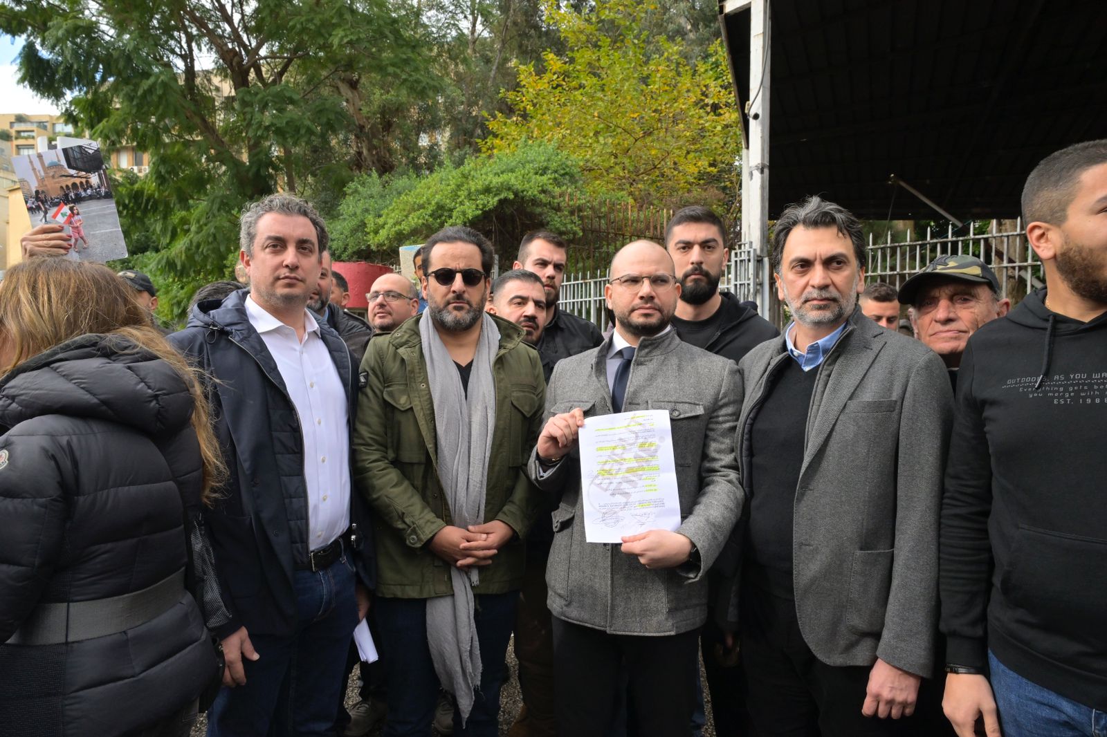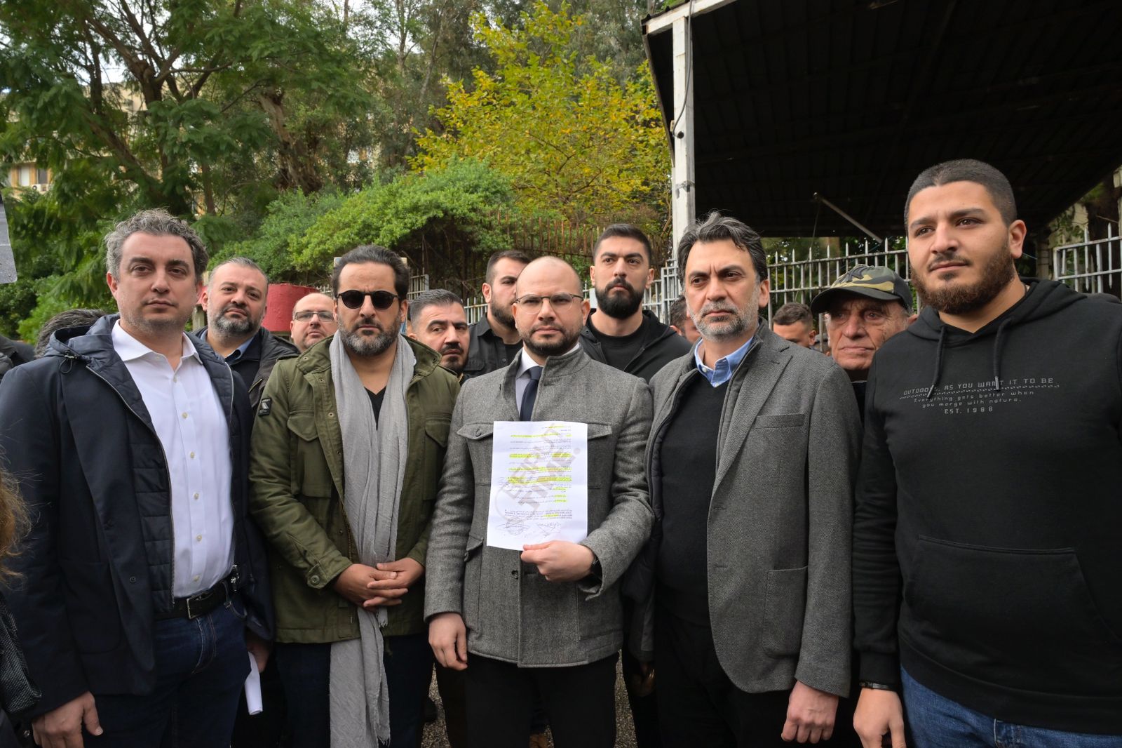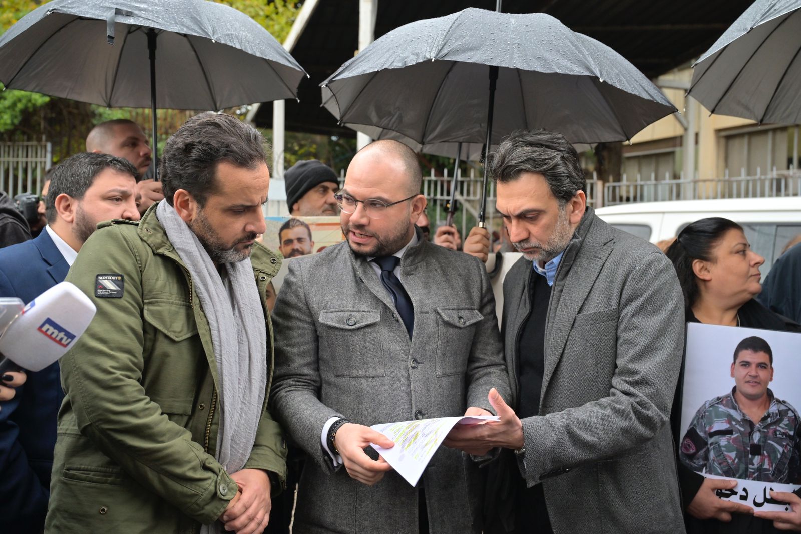 النواب إبراهيم منيمنة، مارك ضو وميشال الدويهي مع الصحافي راض طوق أمام العدلية (نبيل إسماعيل).