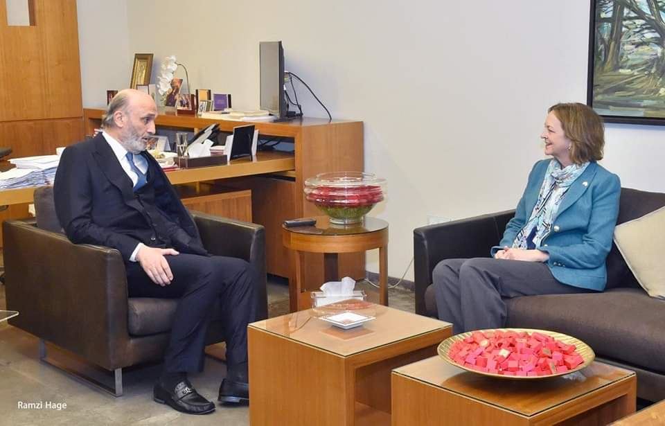 استقبل رئيس "حزب القوات اللبنانية" سمير جعجع وعقيلته عضو "تكتل الجمهورية القوية" النائب ستريدا جعجع في معراب سفيرة الولايات المتحدة الأميركيّة لدى لبنان ليزا جونسون، في زيارة تعارف ترافقها المستشارة السياسية ميغان سولر والمستشار لدى السفارة فادي حافظ، في حضور رئيس جهاز العلاقات الخارجية الوزير السابق ريشار قيومجيان والمسؤول في الجهاز مارك سعد.