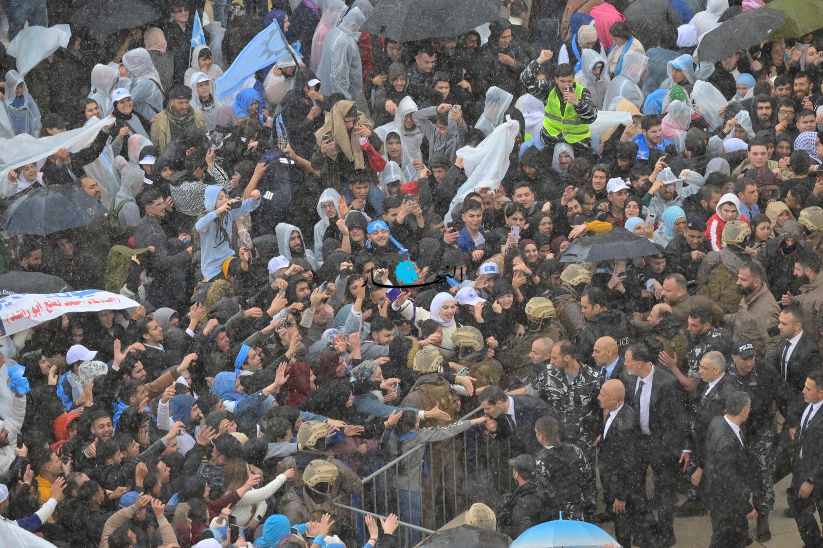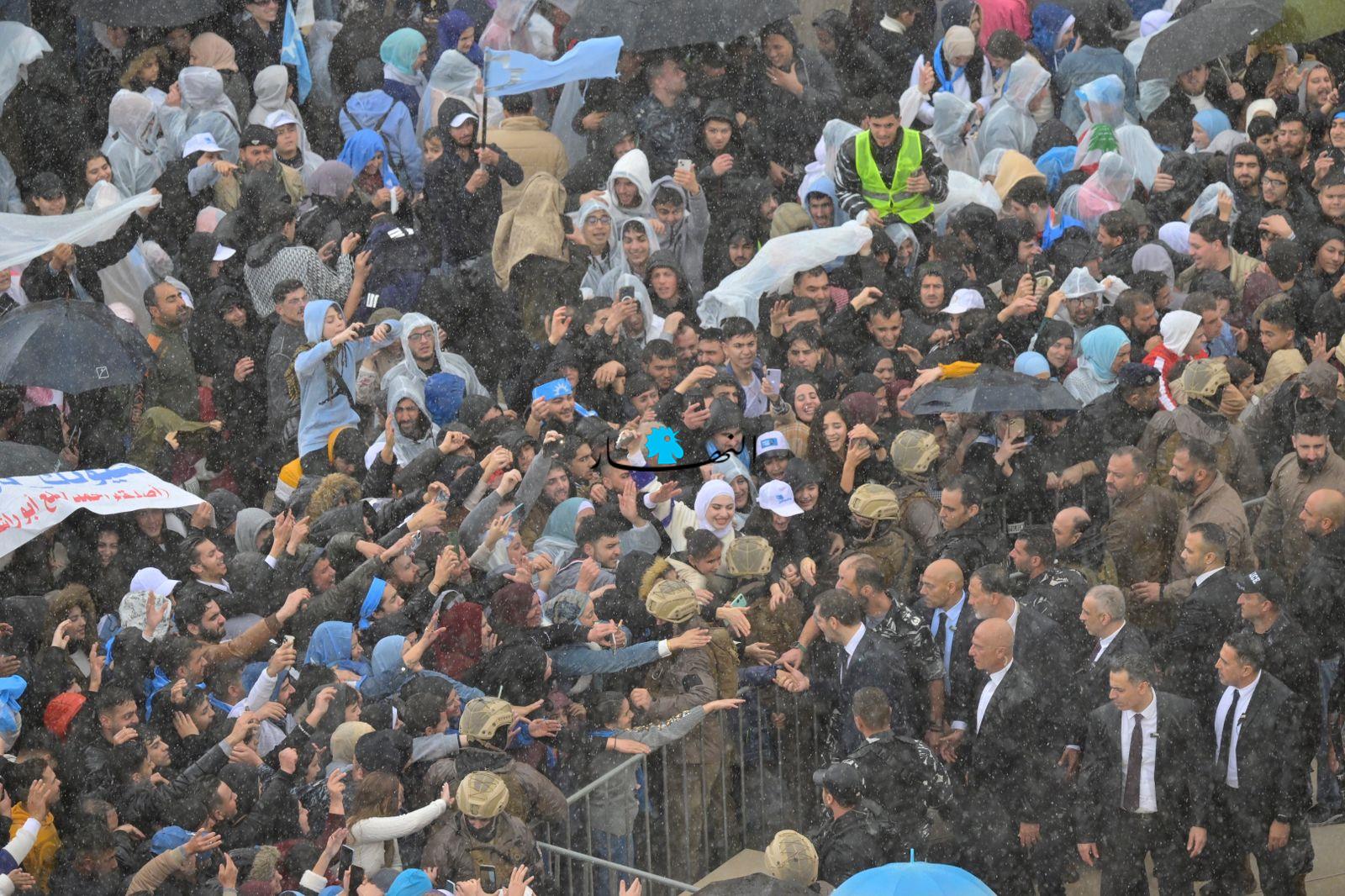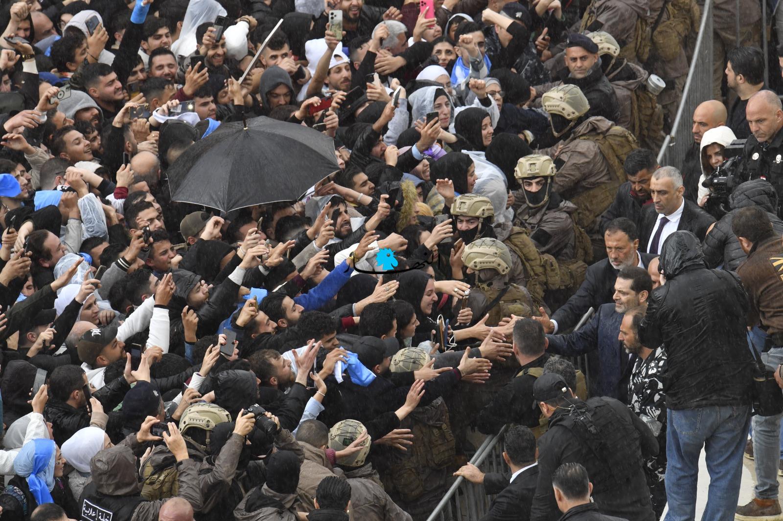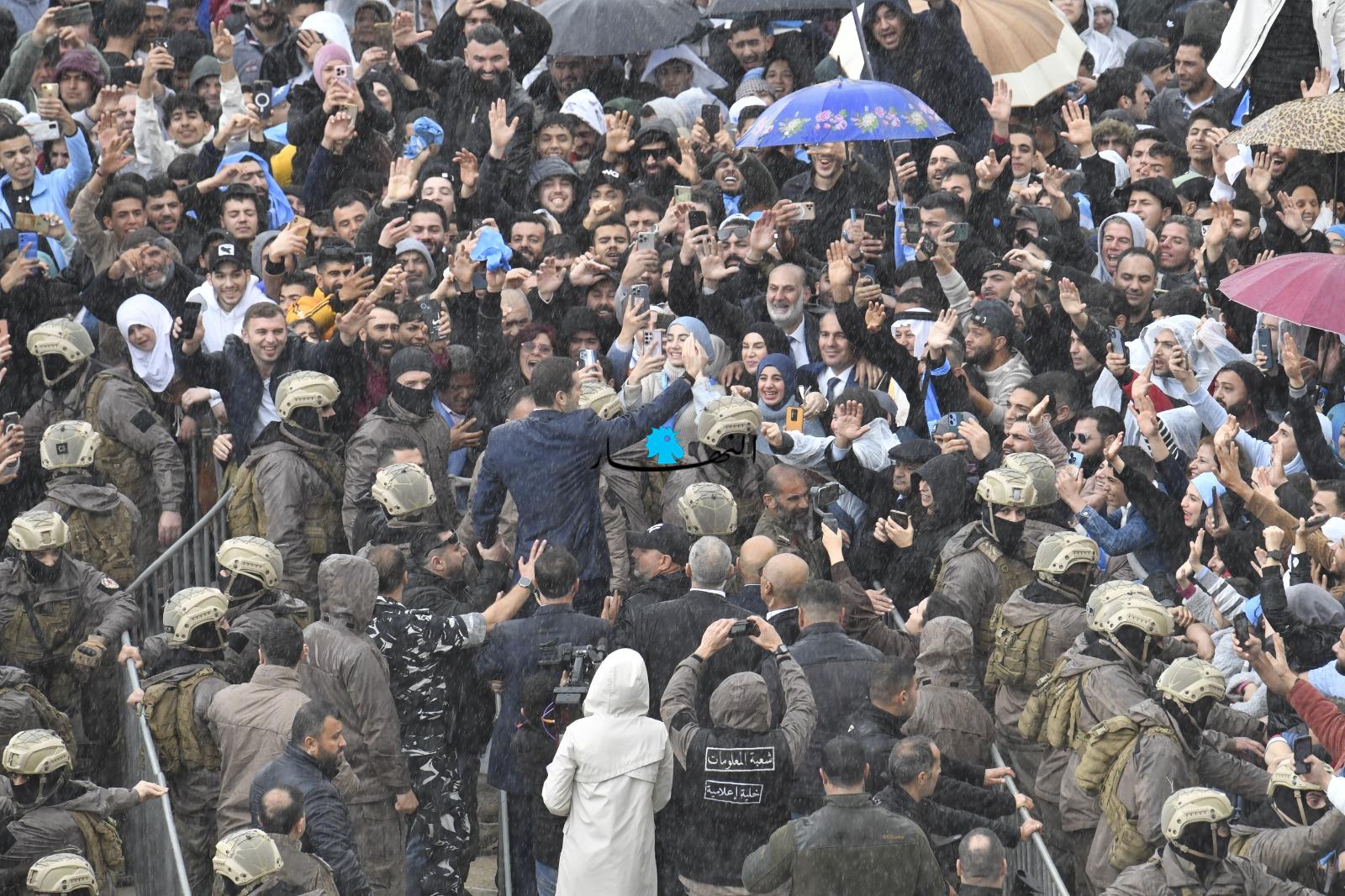 متخطّياً العوائق الحديدية، أبى الرئيس الحريري إلّا أن يلتقي بمحبّيه على تماس مباشر، فوجّه التحية لهم وصافح بعضهم، وقبّل أيدي عدد من النسوة المشاركات، وجال في ما بينهم بمرافقة أمنية مشدّدة.