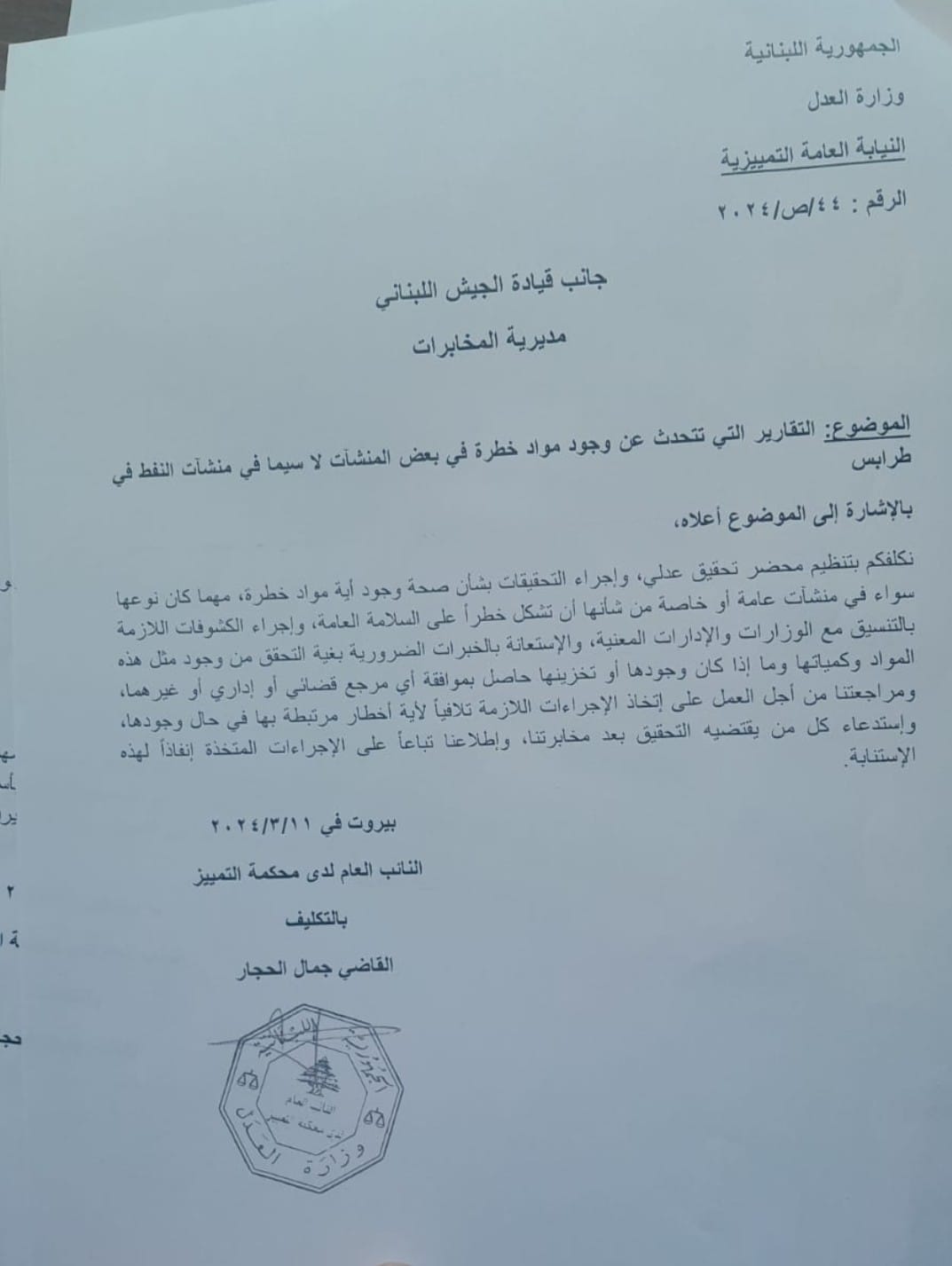 وجاء طلب القاضي الحجار اثر التقارير التي تتحدث عن وجود مواد خطرة في بعض المنشآت ولاسيما في منشآت النفط في طرابلس.