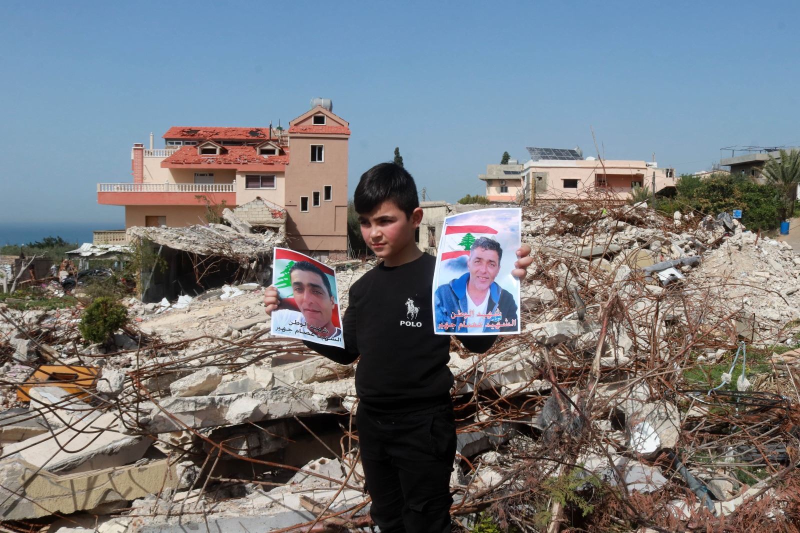 فتى يرفع صورة شهيد في الناقورة على أنقاض مبنى مدمّر جرّاء الغارات الإسرائيلية الأخيرة ليل الأربعاء (أحمد منتش).