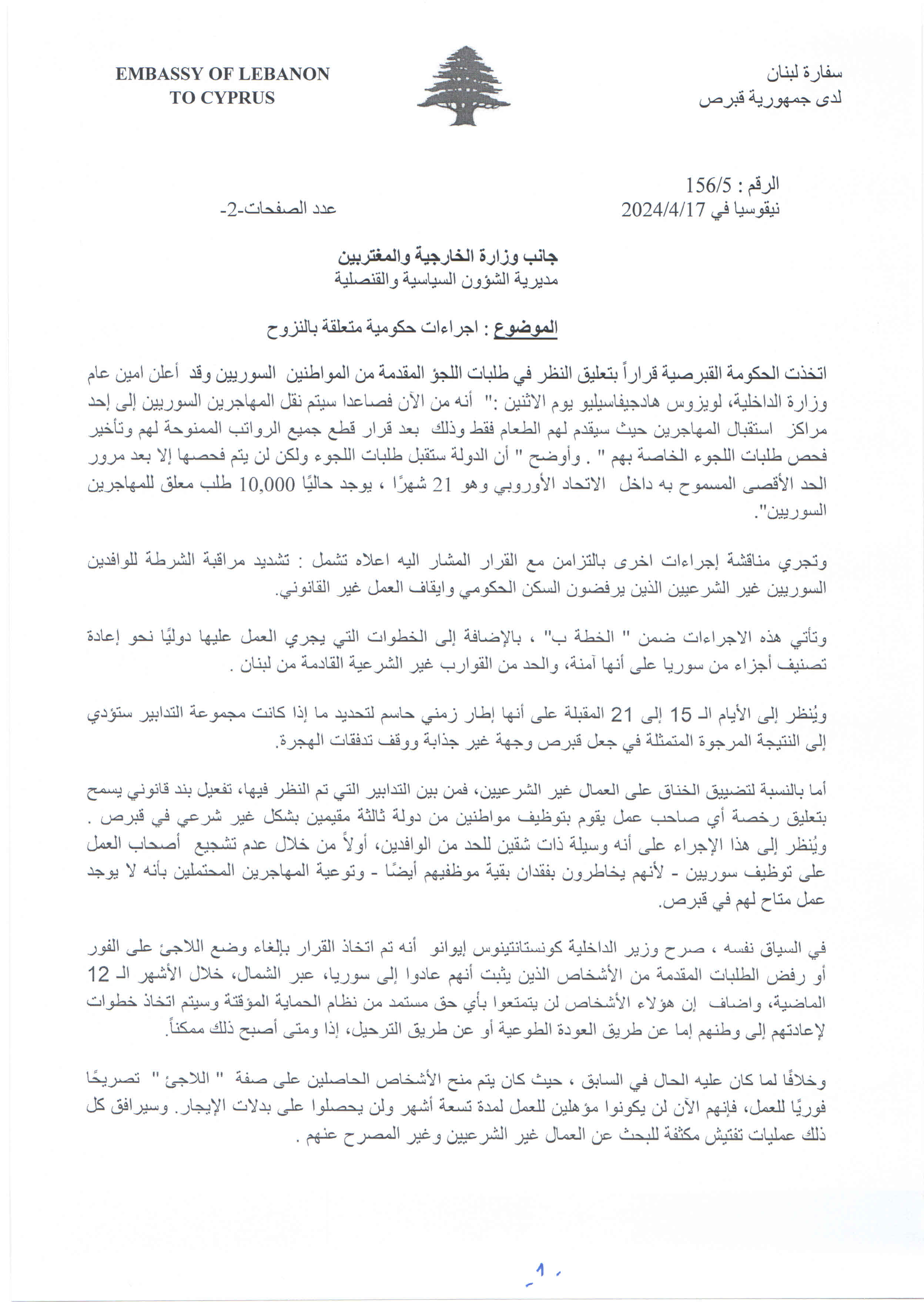 وفي هذا الاطار، حصلت "النهار" على كتاب سفارة لبنان لدى جمهورية قبرص ارسلته امس الى وزارة الخارجية والمغتربين عن "إجراءات حكومية متعلقة بالنزوح"، وفي الكتاب: اتخذت الحكومة القبرصية قراراً بتعليق النظر في طلبات اللجوء المقدمة من المواطنين السوريين وقد أعلن أمين عام وزارة الداخلية، لويزوس هادجيفاسيليو يوم الاثنين: "أنه من الآن فصاعداً سيتم نقل المهاجرين السوريين الى أحد مراكز استقبال المهاجرين حيث سيقدم لهم الطعام فقط وذلك بعد قرار قطع جميع الرواتب الممنوحة لهم وتأخير فحص طلبات اللجوء الخاصة بهم". وأوضح "أن الدولة ستقبل طلبات اللجوء ولكن لن يتم فحصها إلا بعد مرور الحد الأقصى المسموح به داخل الاتحاد الأوروبي وهو 21 شهراً، يوجد حالياً 10,000 طلب معلق للمهاجرين السوريين".