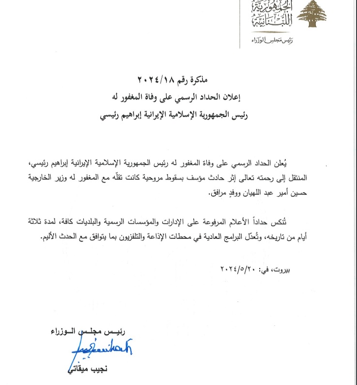 أصدر رئيس حكومة تصريف الأعمال نجيب ميقاتي مذكّرة تحمل الرقم 2024/18 بإعلان "الحداد الرسمي ثلاثة أيام على وفاة رئيس الجمهورية الإسلامية الإيرانية إبراهيم رئيسي".