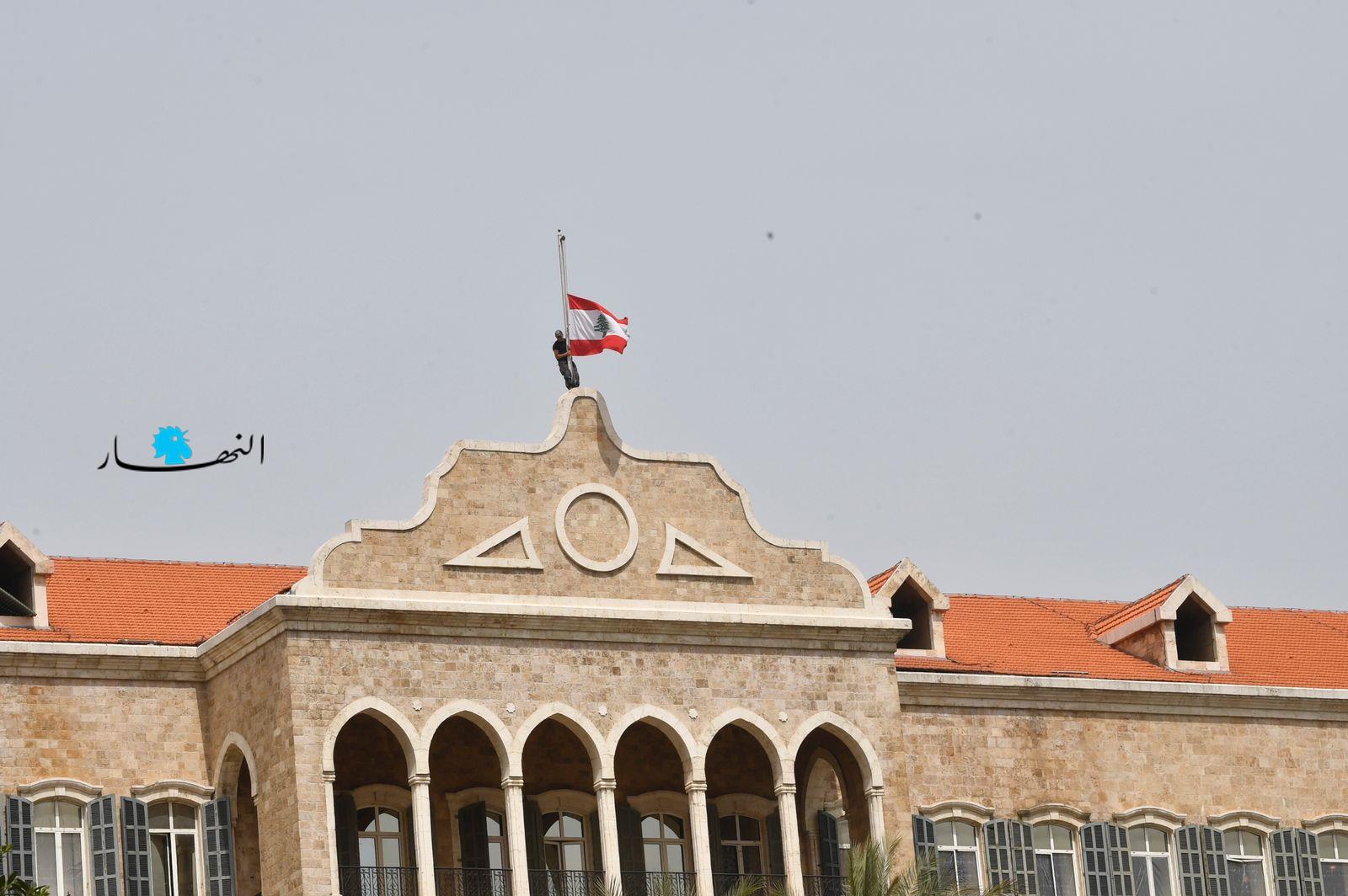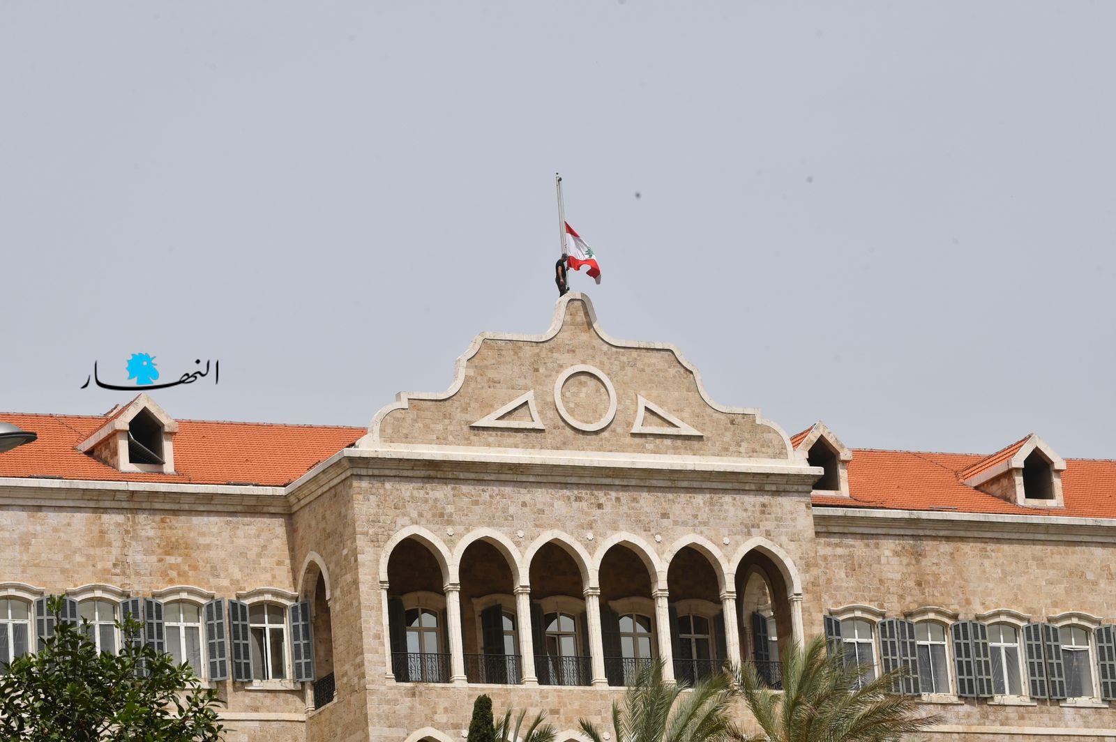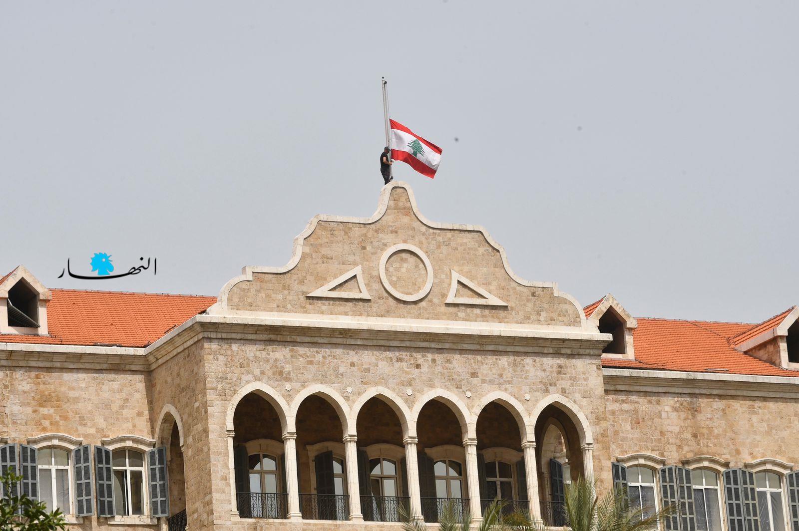 تنكيس العلم اللبناني على السرايا الحكومية إنفاذاً لمذكّرة الحداد الرسمي في لبنان (نبيل اسماعيل).