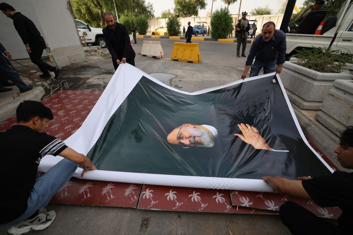 تعليق صورة ضخمة للرئيس الإيراني الراحل إبراهيم رئيسي خارج سفارة الجمهورية الإسلامية في بغداد (أ ف ب).