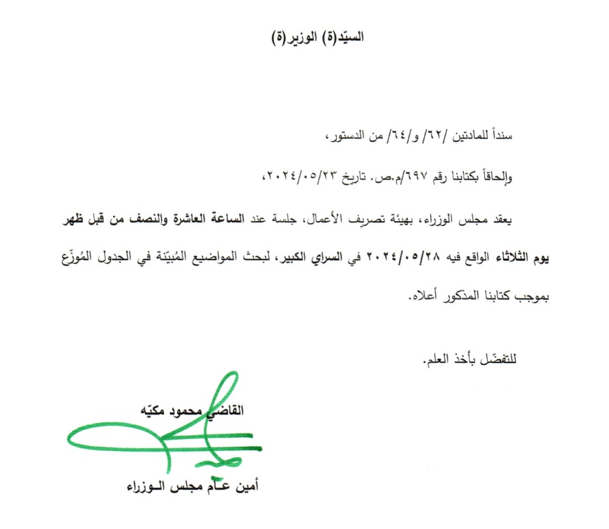 دعت الأمانة العامة لمجلس الوزراء إلى عقد جلسة للحكومة بهيئة تصريف الأعمال يوم الثلثاء في 28 أيار الجاري، عند الساعة العاشرة والنصف صباحاً، وذلك لبحث عدد من البنود على جدول الأعمال والموزّعة مسبقاً.