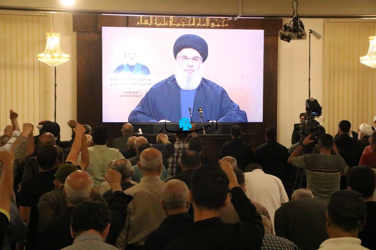 وأردف نصرالله: "بيئة المقاومة مازات حاضرة وصابرة وصادقة وببركة وعيها وثقافتها وإيمانها وإخلاصها كان الانتصار في 25 أيار 2000 وكان هذا الإسناد في الجبهة الجنوبية اليوم".