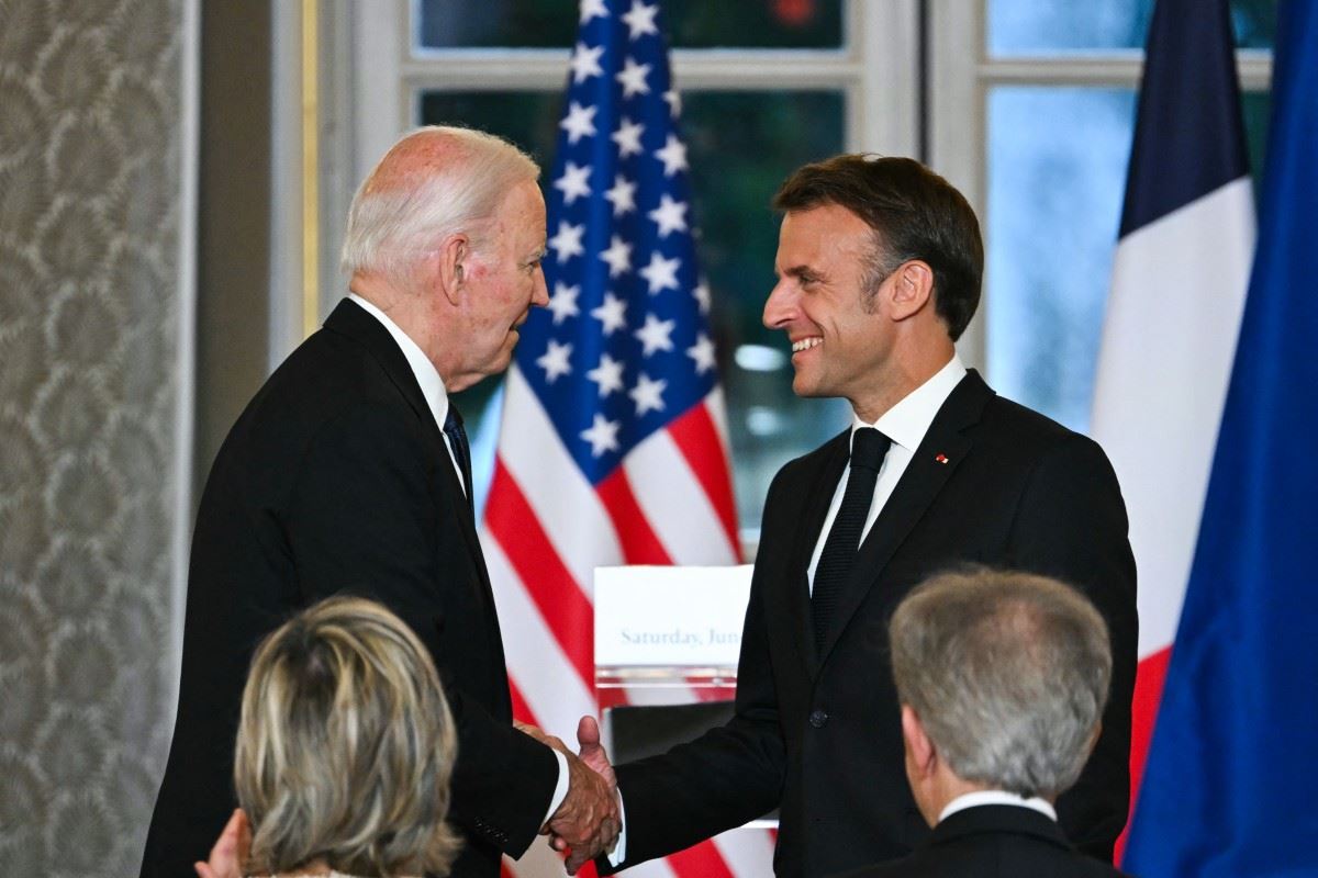 الرئيسان الأميركي جو بايدن والفرنسي إيمانويل ماكرون في ذكرى إنزال النورماندي (أ ف ب).
