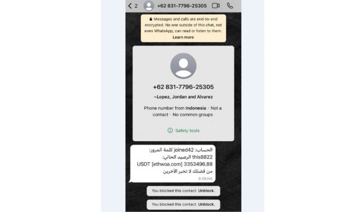 "يتلقى عدد من المواطنين عبر تطبيق "واتساب" رسالة نصية من أرقام أجنبية، توهم المواطن بوجود حساب بداخله مبلغ كبير بالعملة الرقمية "USDT" التي تساوي (1 USDT= 1$)، بعد الدخول عبر الحساب وكلمة المرور المعطاة من قبل المقرصن، ثم يطلب منه أن يدفع مبلغاً من المال من أجل تحريره، ليتبين لاحقا أن المبلغ والحساب وهميان.