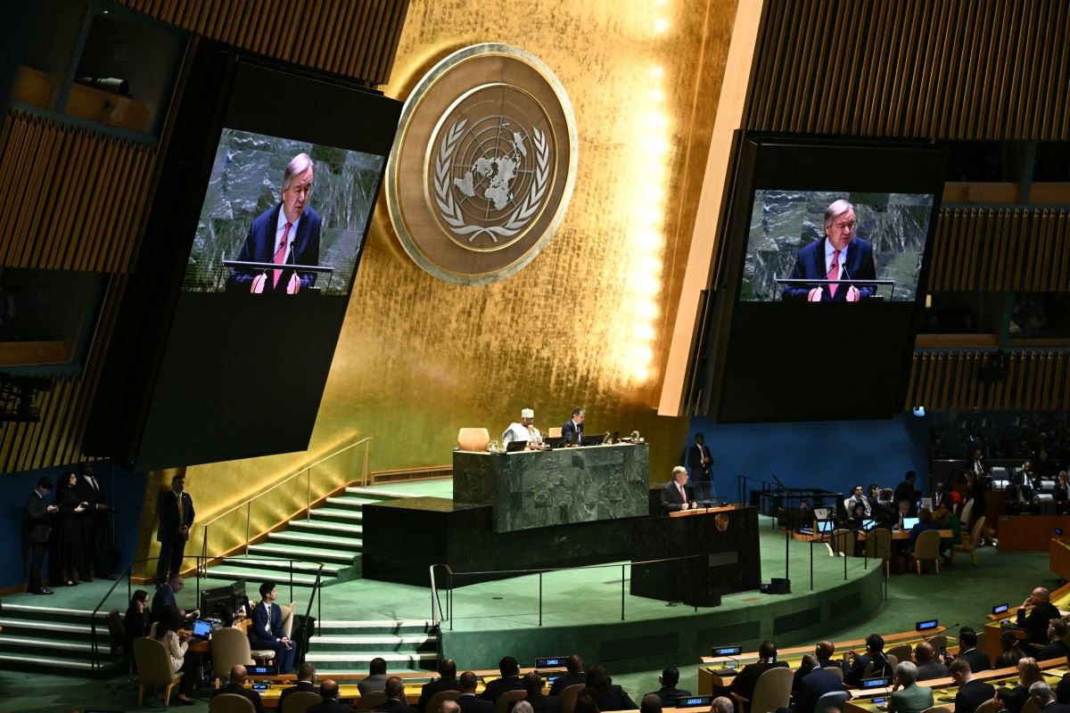غوتيريس متكلما خلال الدورة الـ79 للجمعية العامة للأمم المتحدة في مقر الأمم المتحدة في مدينة نيويورك (24 ايلول 2024، أ ف ب).