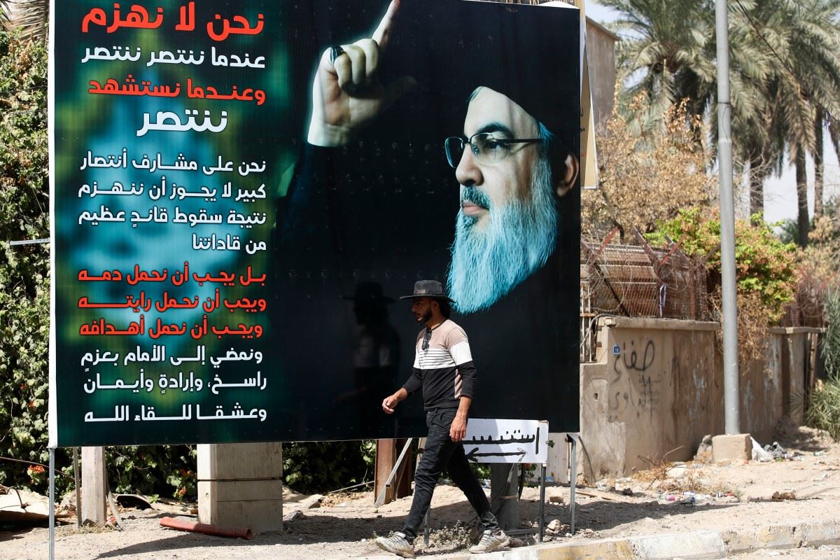 صورة كبيرة لنصرالله بعد اغتياله (أ ف ب).