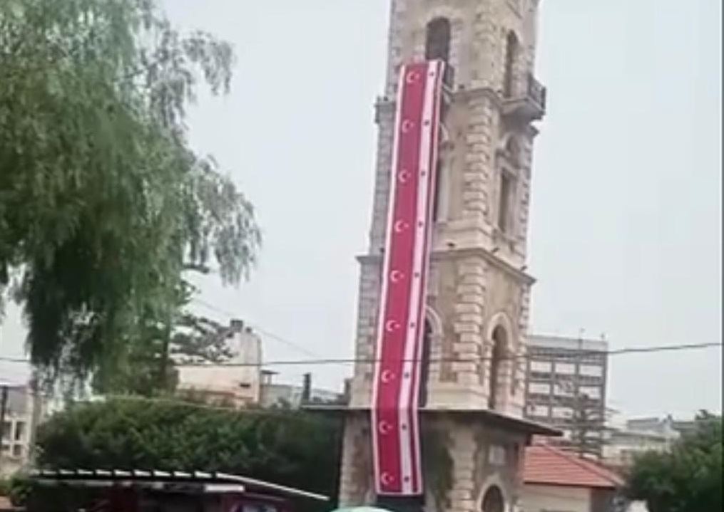 العلم التركي مرفوعاً على مجسم ساعة التل.
