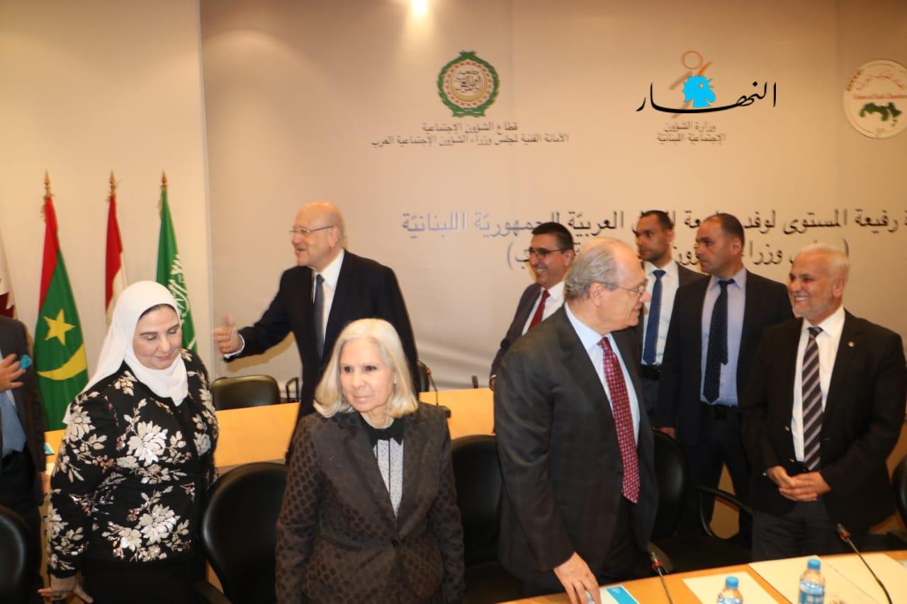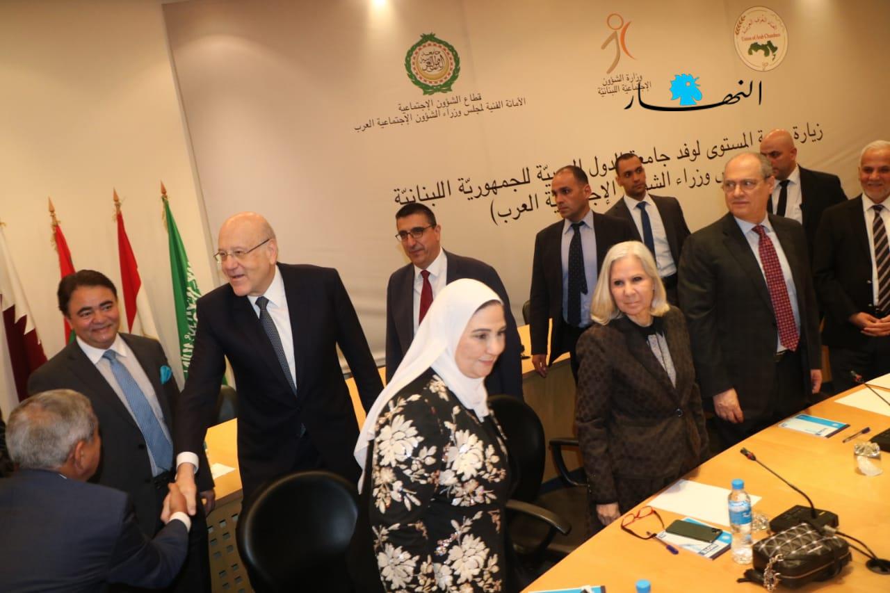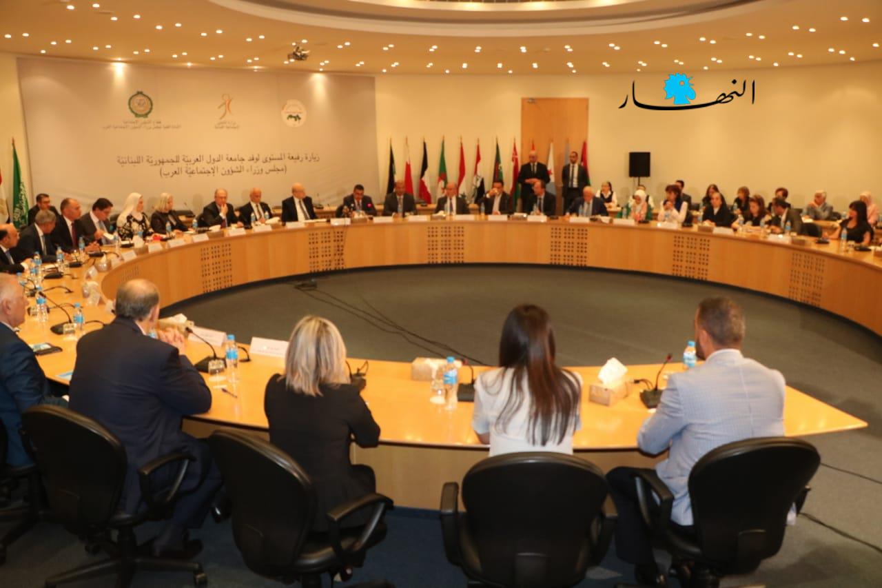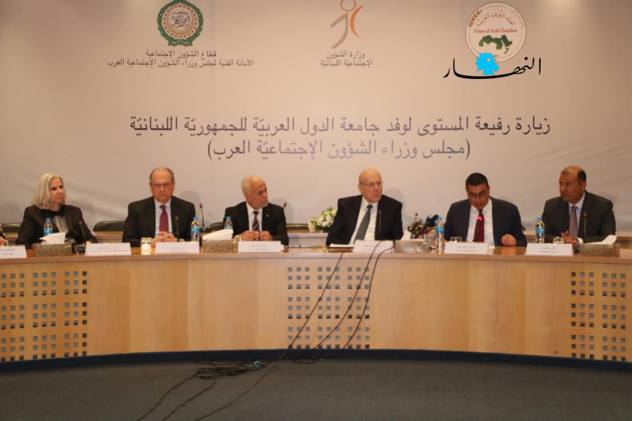 وقال: "نحن نشكر ونقّدر مبادرة الجامعة العربية ومعالي الوزراء بزيارة بلدنا لاستطلاع الوضع الاجتماعي في لبنان ومدى تأثيره على الفئات الهشة تمهيدا لبحث السبل التي تترجم وقوف الجامعة وأعضائها إلى جانب لبنان، وننتظر من أشقائنا العرب أن يتفهّموا واقعنا جيداً، ويؤازروننا في هذه المرحلة بالذات، لتجنيب لبنان الأخطار ولمساعدته على تحمّل الأعباء التي فاقت قدراته وليستعيد عافيته. ونحن واثقون أنكم ستحملون معنا هذه الهواجس وستكونون المدافعين عنها في كل المحافل".