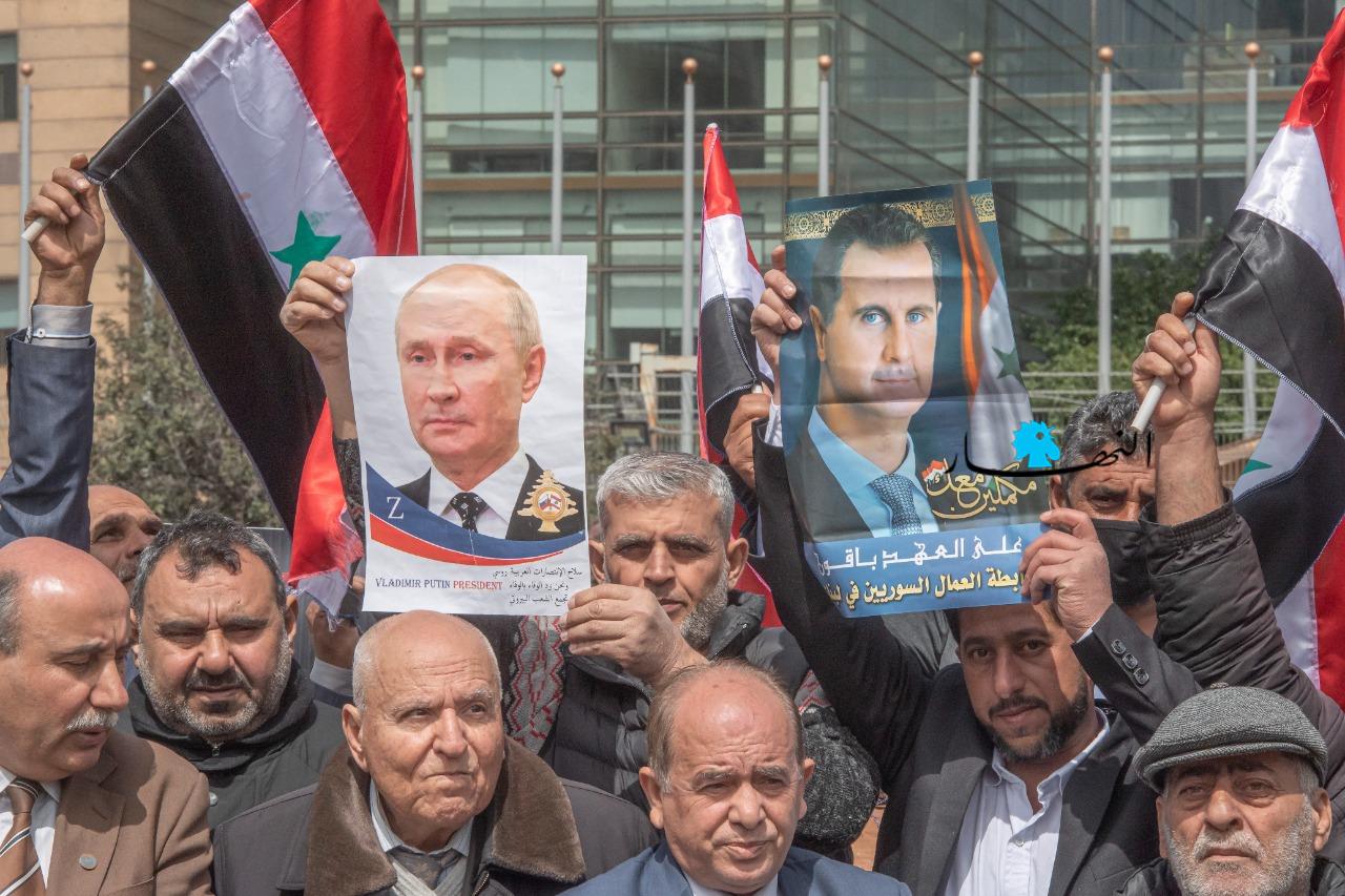 وتم رفع صور للرئيسين الروسي والسوري فلاديمير بوتين وبشار الأسد، كما رُفعت الأعلام السورية والروسية.
