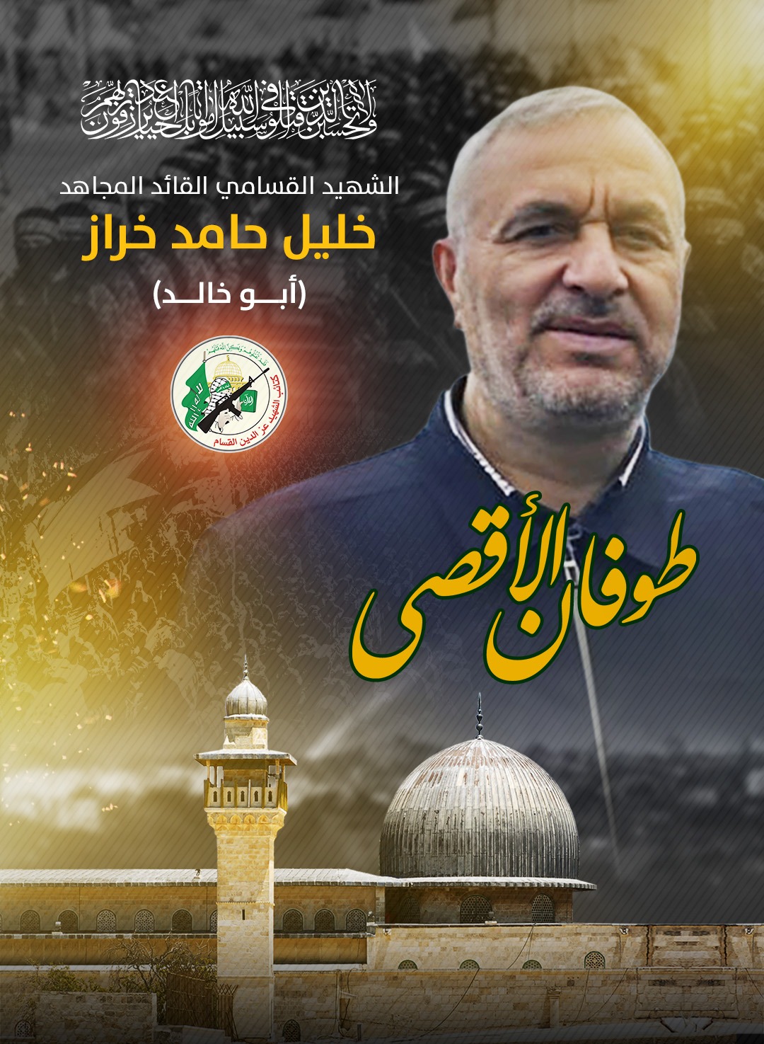"تزف كتائب الشهيد عزالدين القسام إلى شعبنا الفلسطيني وأمتنا العربية والإسلامية،القائد القسامي المجاهد: خليل حامد خرازِ "أبوخالد"، من مخيم الرشيدية ،الذي اغتالته يد الغدر الصهيوني على مشارف فلسطين المحتلة في الجنوب اللبناني، يوم الثلاثاء 21 تشرين الثاني 2023م الموافق 7 جمادى الأولى 1445هـ".