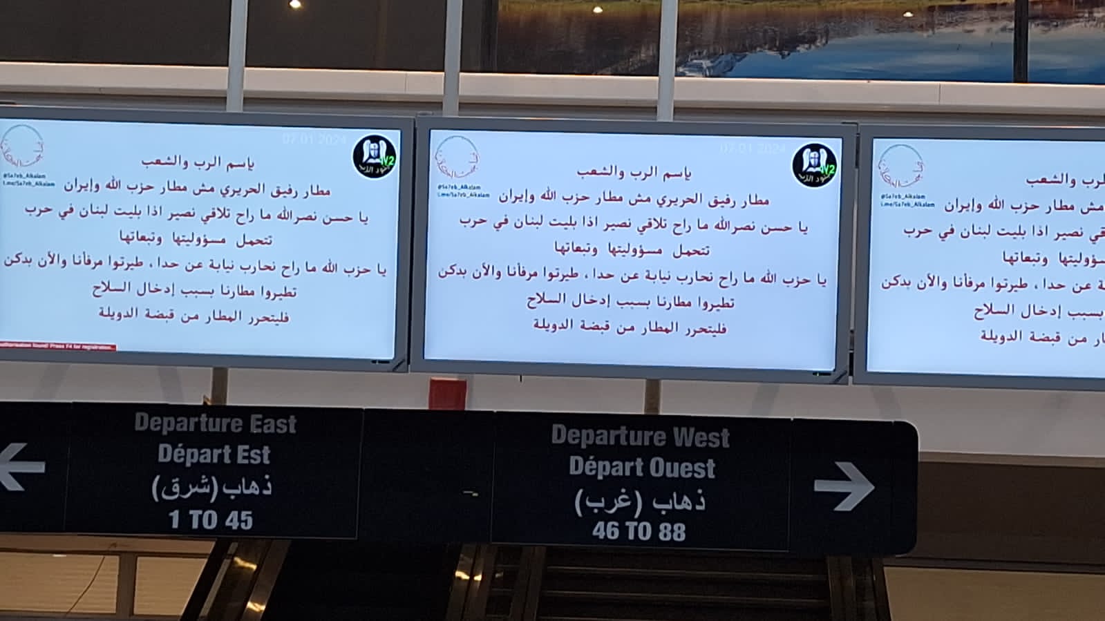 شهد مطار رفيق الحريري قرصنةً لشاشات الإعلانات الموجودة داخله، وظهرت على الشاشات رسائل إلى "حزب الله" وأمينه العام السيد حسن نصرالله، باسم "الرب والشعب"، تُطالبهما بعدم إقحام لبنان في حرب وتتهمهما بإدخال السلاح عبر المطار.