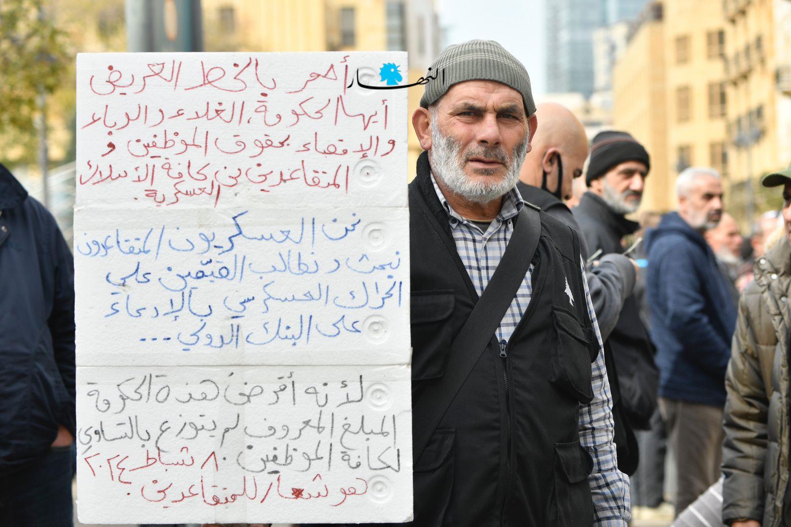 ويأتي اعتصام العسكريين المتقاعدين أمام السرايا الحكومية دفاعاً عن حقوقهم وحقوق كل الموظفين والعسكريين والمتقاعدين بالعدالة والمساواة والحدّ الأدنى للعيش الكريم، والتي تتلخص، بحسب ما يؤكد منسّق الشؤون الإعلامية لـ"تجمّع الولاء للوطن" العميد الركن الطيار المتقاعد أندره بو معشر، بما يأتي: